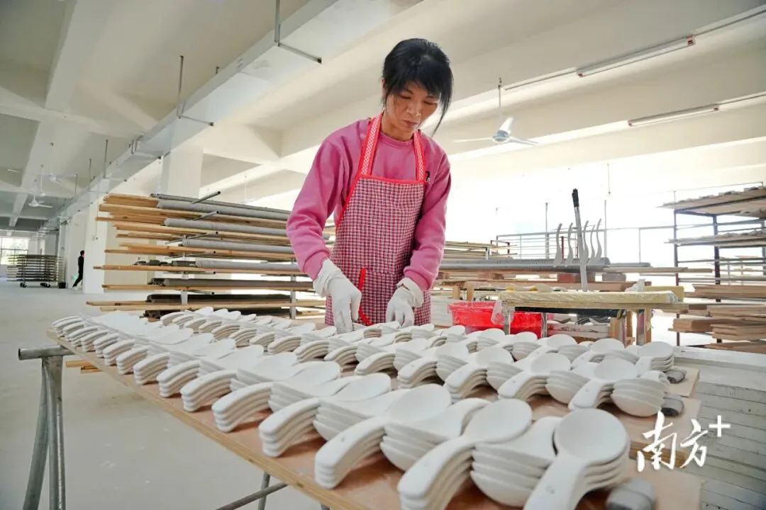 “叮叮叮”,一只只洁白如玉的筷子被工人小心地放入一旁的箱子中,彼此间轻轻碰撞,发出清脆的声响,似在诉说又一批订单即将完成;另一边的铁架上,一只只瓷制的汤勺整齐悬挂,构成一面泛着光泽的白墙……来到广东德顺陶瓷有限公司的生产车间,犹如走进瓷器的海洋,各种精致的日用陶瓷令人惊叹不已。