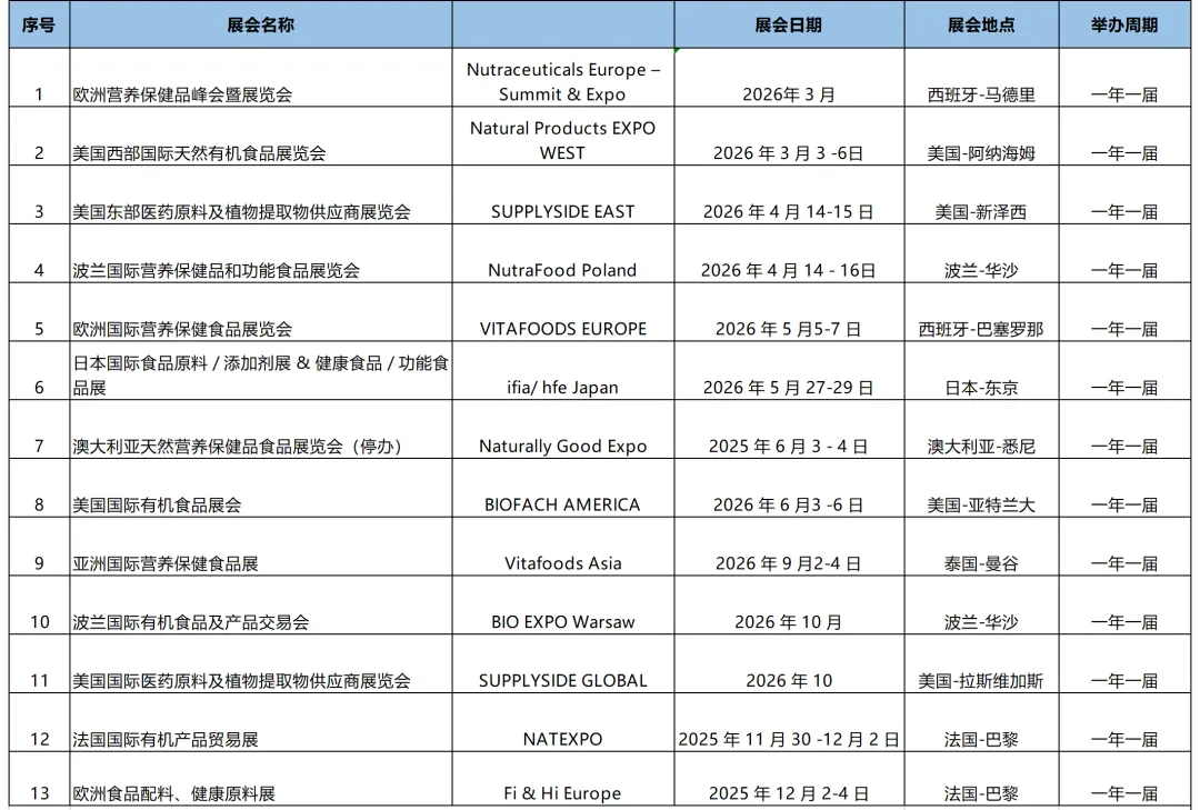 2026年全球热门保健品展会计划表
