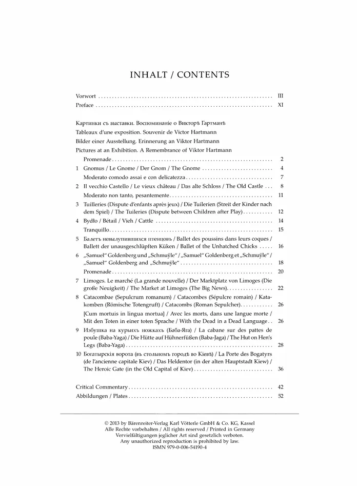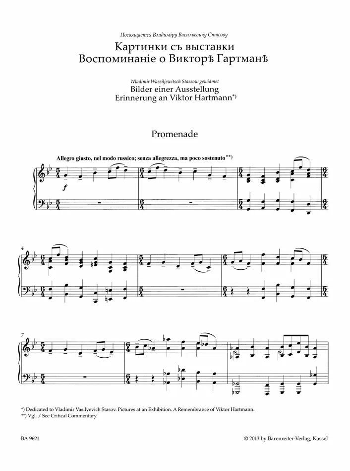 《图画展览会》是俄罗斯作曲家莫杰斯特·穆索尔斯基于1874年创作的著名钢琴组曲,为纪念已故画家朋友维克托·哈特曼而作。全曲共十个段落,以音乐描绘哈特曼画作中的各个场景,包括:侏儒、古堡、杜伊勒里宫的花园、牛车、蛋中小鸡的舞蹈、穷富市集、墓穴、鸡脚上的小屋、基辅的大门等。这部作品是古典音乐时期最具创新性的钢琴作品之一,后由法国作曲家拉威尔改编为管弦乐版本,使其更加闻名于世。