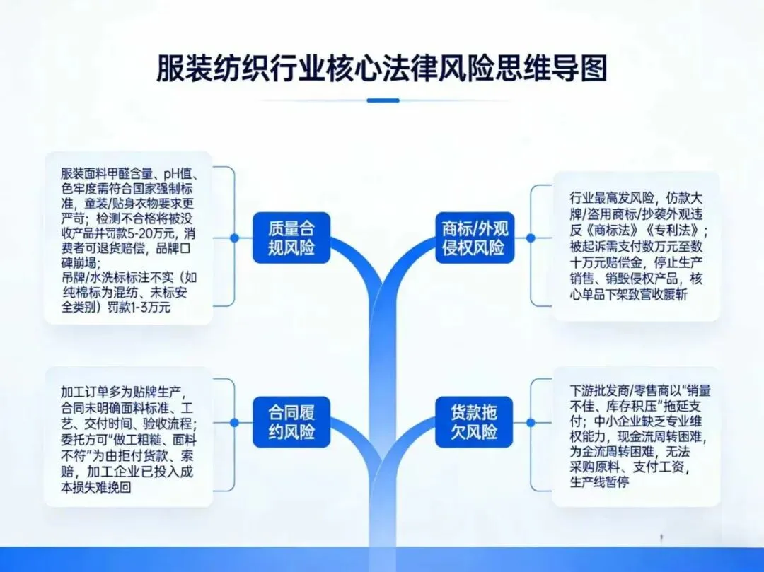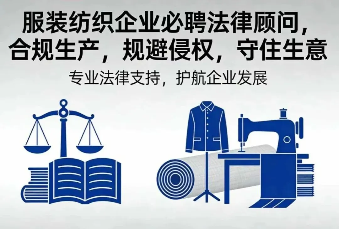 服装纺织行业门槛低、同质化竞争激烈,核心法律风险集中在质量合规(面料安全、标识标注)、商标/ 外观侵权(仿款大牌、盗用商标)、合同履约(加工订单条款模糊)、货款拖欠四大板块,叠加《产品质量法》《商标法》《消费者权益保护法》约束,一款单品面料不合格、商标侵权,就可能引发巨额罚款、索赔,薄利经营的中小企业,单起纠纷就足以拖垮整盘生意。如同车主未交车险,服装纺织企业无法律顾问,易陷入合规处罚、侵权索赔困境,一次失误就可能满盘皆输;聘请法律顾问,规范质量检测、排查侵权风险、审核加工 / 购销合同,花小钱守住经营底线、规避巨额损失,是服装纺织企业稳健发展的关键。