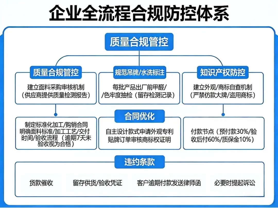 法律顾问入驻后,为企业搭建了全流程合规防控体系:一是质量合规管控,指导企业建立面料采购审核机制,要求供应商提供质量检测报告,每批产品出厂前进行甲醛、色牢度抽检,留存检测记录;规范吊牌、水洗标标注,明确安全类别、面料成分、洗涤说明,杜绝标注瑕疵。二是知识产权防控,建立外观、商标自查机制,严禁仿款大牌、盗用商标,指导企业对自主设计的款式申请外观专利,保护自身创意;承接贴牌订单时,审核委托方的商标授权证明,避免陷入连带侵权。三是合同优化,结合行业特点制定标准化加工/ 购销合同,明确面料标准、加工工艺、交付时间、验收流程(逾期 7 天未验收视为合格)、付款节点(预付款 30%、验收后付 60%、质保金 10%)和违约条款,堵塞漏洞。四是货款催收,指导企业留存供货、验收凭证,客户逾期付款后第一时间发送律师函,必要时提起诉讼,确保现金流稳定。