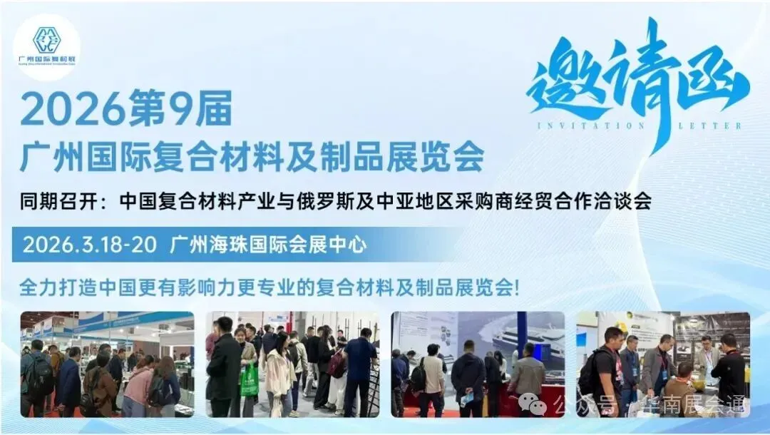第9届广州国际复合材料及制品展览会将于3月18日-20日在海珠国际会展中心举办。本次展会聚焦复合材料全产业链,精心设置了多个主要展区,包括复合材料及辅料类展区(涵盖纤维及增强材料、树脂、胶黏剂等)、复材制品类展区(展示碳纤维、玻纤等制品)以及其他复合材料展区(如真空材料、轻质材料等)。此外,还有复材生产设备展区,展出各类新成型技术及设备。