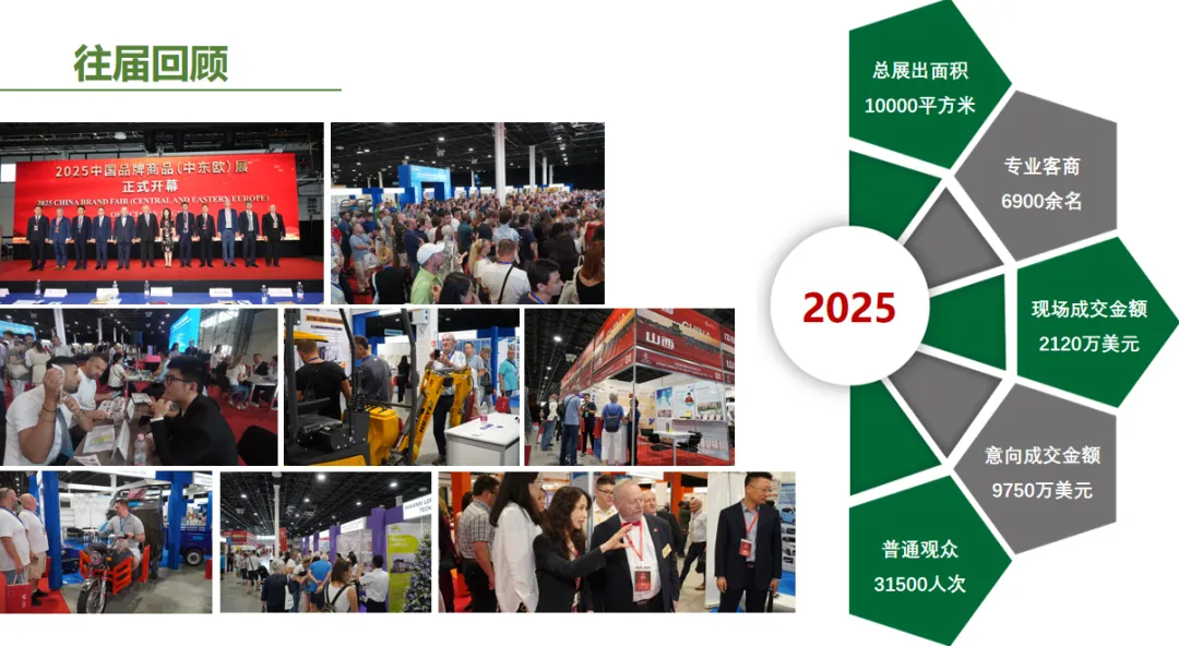 2025年中国品牌商品(中东欧)展,展会规模10000平方米,参展企业来自于全国17 个地市(参展地市历届最多)270 家企业。展品涉及电动汽车及零部件、机电、五金建材、新能源、轻纺、农副产品等领域,共吸引匈牙利、塞尔维亚、罗马尼亚、捷克、斯洛伐克等10 余国约 8000 名专业采购商参会,为中国品牌搭建了中东欧核心市场的直接对接渠道。