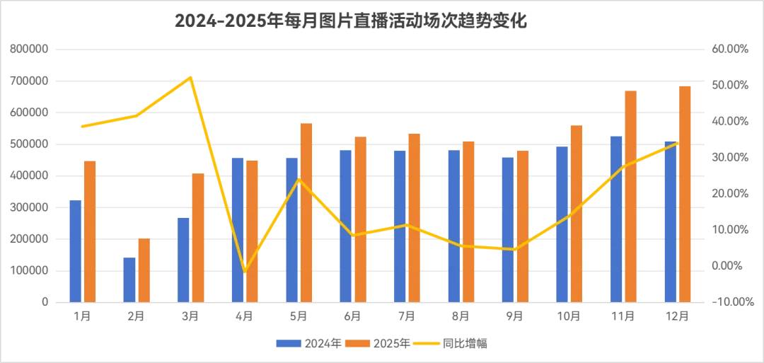 2025年图片直播全年总场次6032250场,同比增幅18.83%,市场对影像服务的需求持续增长,但增速逐步放缓。