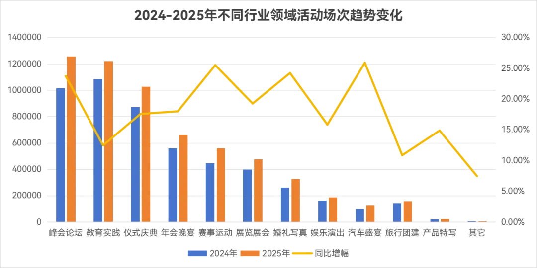 不同领域的增长分化特征明显:峰会论坛、赛事运动、婚礼写真、汽车盛宴成为年度增长亮点,对应场次较2024年均实现25%左右的显著提升。