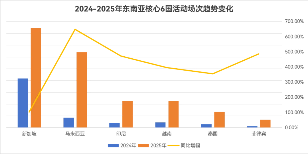 在东南亚市场,Piufoto同样稳步增长。2024-2025年,Piufoto在东南亚核心6国的活动场次整体增幅达304.69%,其中马来西亚增幅高达648.48%,表现尤为亮眼。