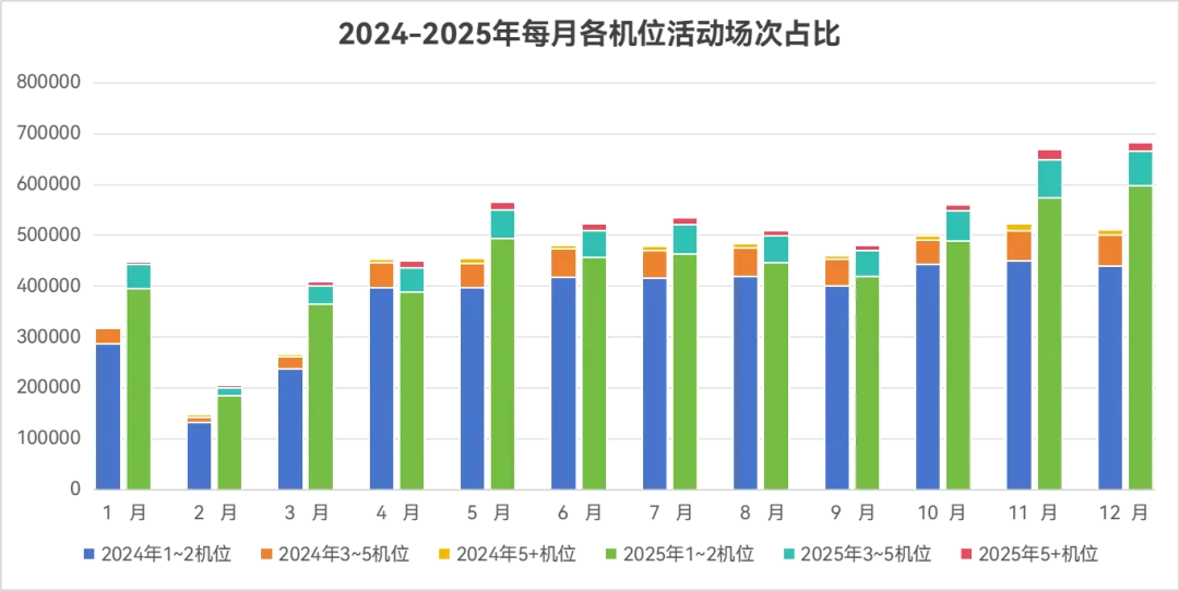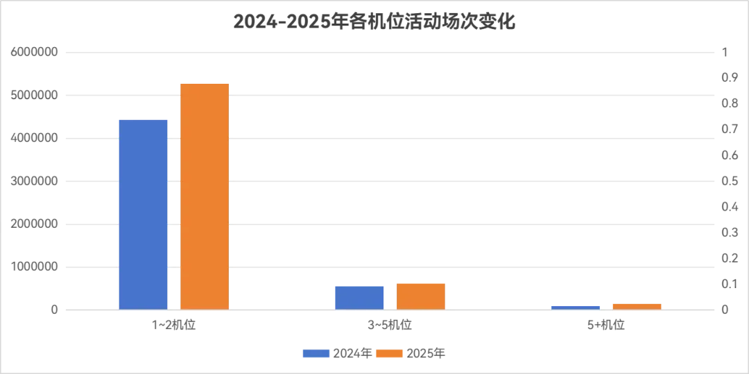 从活动机位对应的规模维度看,2024-2025年不同机位配置对应的活动场次均呈现增长态势,其中1~2机位的小型活动占比持续稳定在87%左右,可见轻量化、高效率的小型活动始终是行业最普遍的需求场景。