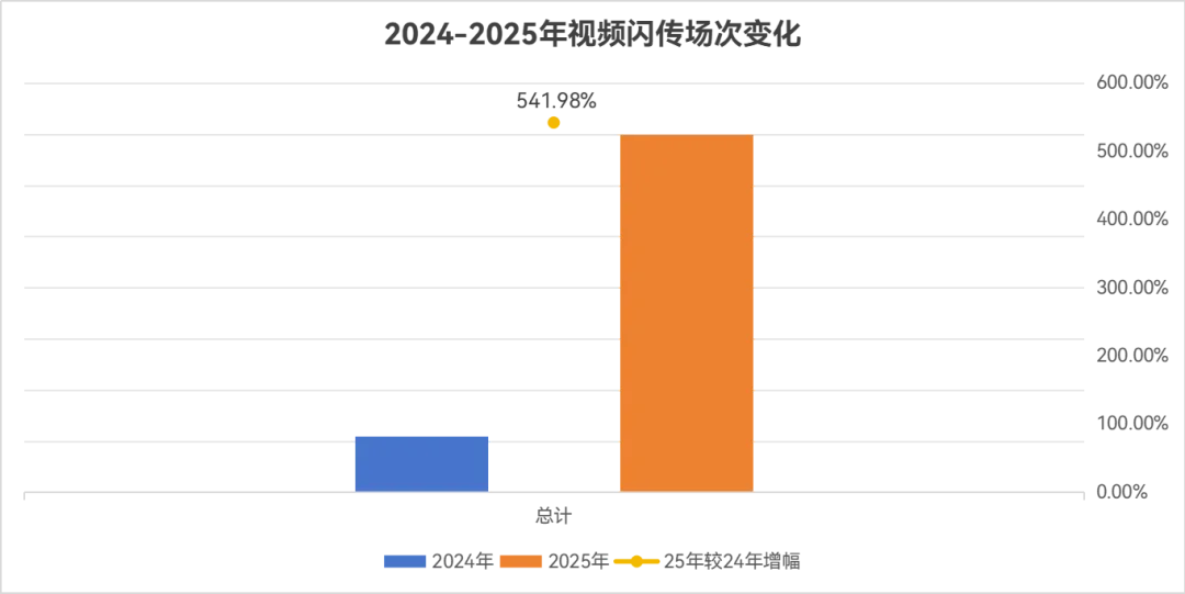 2025年视频闪传活动场次呈爆发式增长,同比增幅达541.98%,全年始终维持着数倍级的高增长态势,直观体现即时短视频需求进入爆发期。