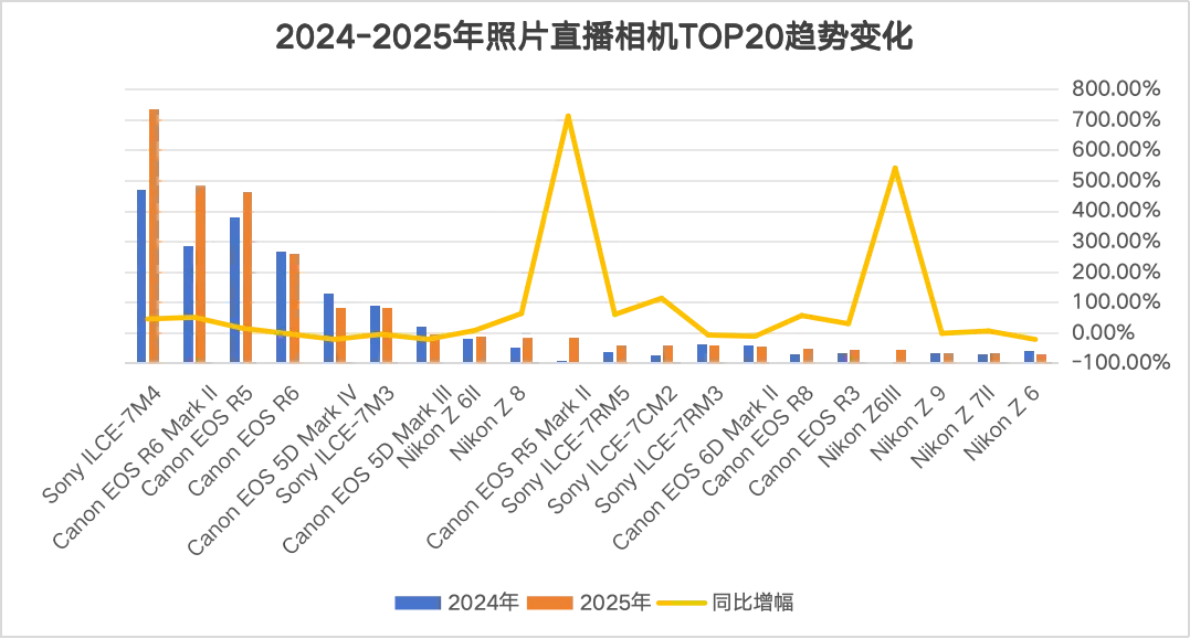 基于2024-2025年照片直播相机TOP20榜单数据,可以看到索尼、佳能、尼康三强格局稳固。