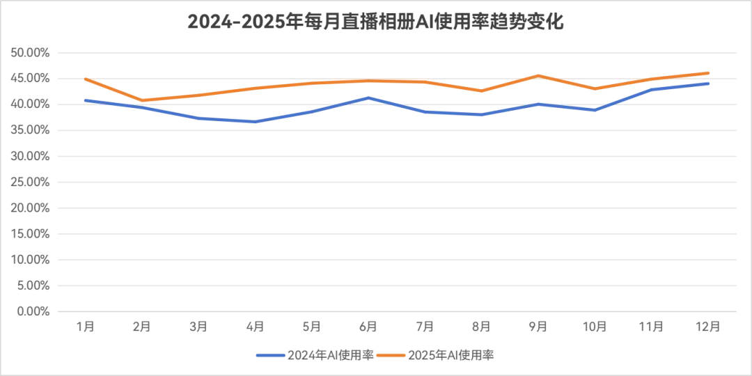 2024-2025年相册AI工具使用率呈稳步抬升态势,2025年各月使用率均高于2024年。2024年整体使用率为39.89%,2025年升至44.03%。