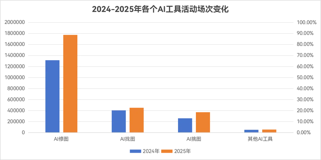 从各个AI工具的活动场次变化来看,2025年使用AI修图的活动场次增幅达到35%,是活动场景中的核心高频应用工具;AI挑图使用率同样涨幅明显,因其可以高效完成照片初筛,减少人力投入。