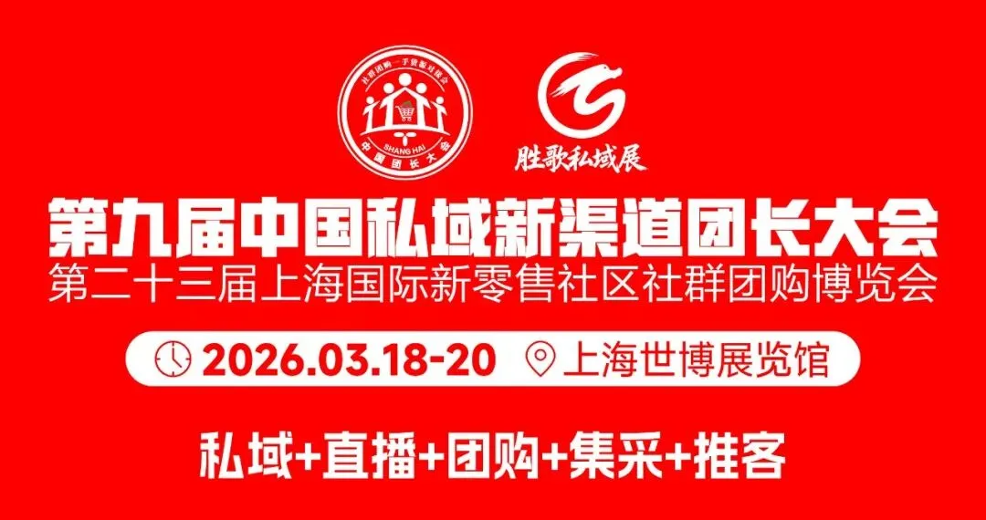 第九届中国私域新渠道团长大会暨第二十三届上海国际新零售社区社群团购博览会将于2026年3月18 - 20日在上海世博展览馆盛大举办。本届展会由上海市浦东新区电子商务行业协会与上海胜歌展览服务有限公司联合主办。历经多届深耕与积累,展会已成为行业风向标,吸引超10000+热门SKU单品惊艳亮相,全面覆盖大健康营养滋补品、食品生鲜、药食同源、箱包服饰、地标非遗特产、美妆个护、婴童用品、家纺个护等全品类商品。现场将设立多个主题展区,构建高效、精准的对接平台,助力参展商和渠道商深度交流、资源联动与合作共赢,共同推动私域渠道生态的繁荣与创新。