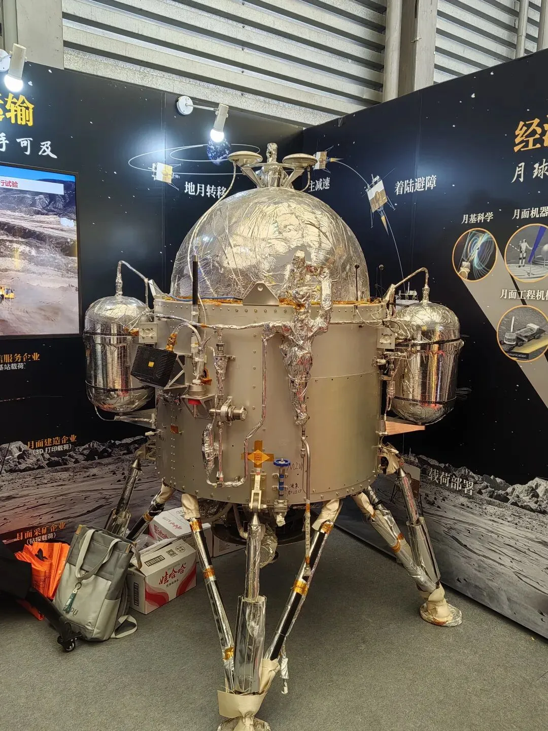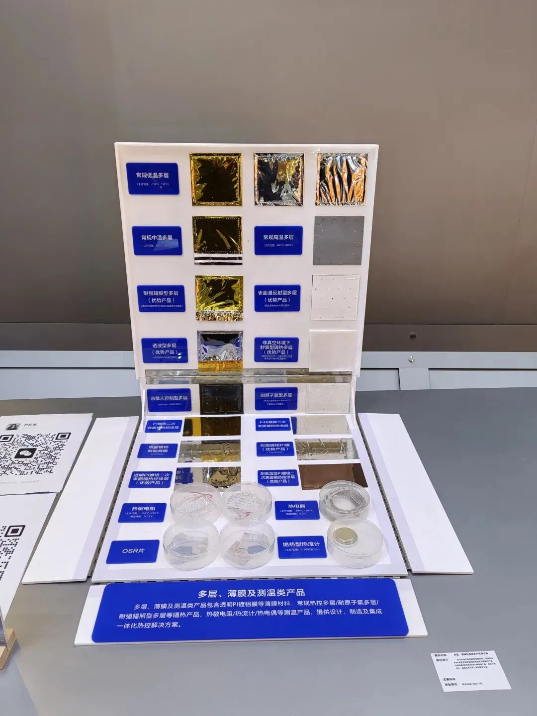 旁边星辉航天的展台,则像是走进了太空时装店。各种泛着光泽的薄膜卷筒整齐排列,金色的、银色的,在灯光下闪烁。工作人员刘凡宁拿起一个被金色薄膜包裹的卫星模型,形象地打了个比方:“卫星裹上这层薄膜,就好比穿上了一层隔热隔冷的羽绒服。”