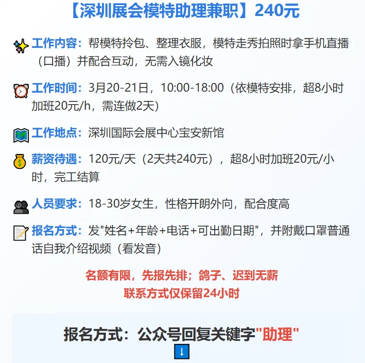 【深圳兼职】深圳展会&模特助理兼职丨240元,帮模特拎包、整理衣服,走秀拍照时拿手机直播(口播)并配合互动,无需入镜化妆.