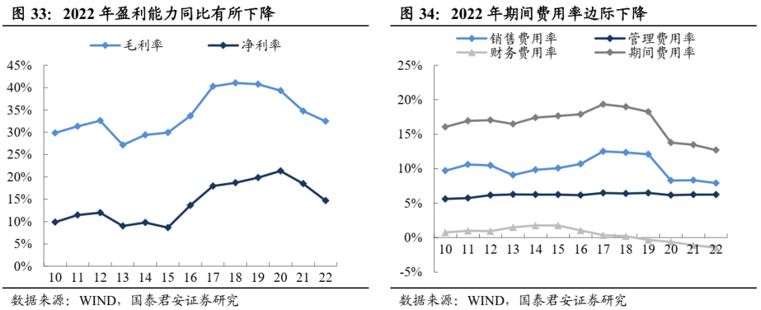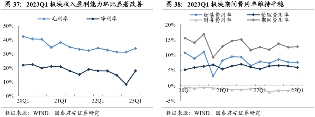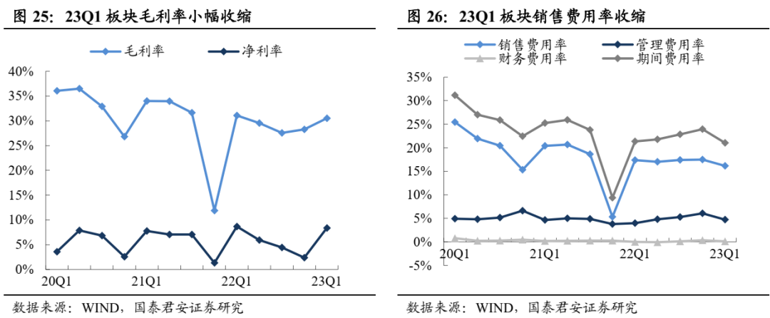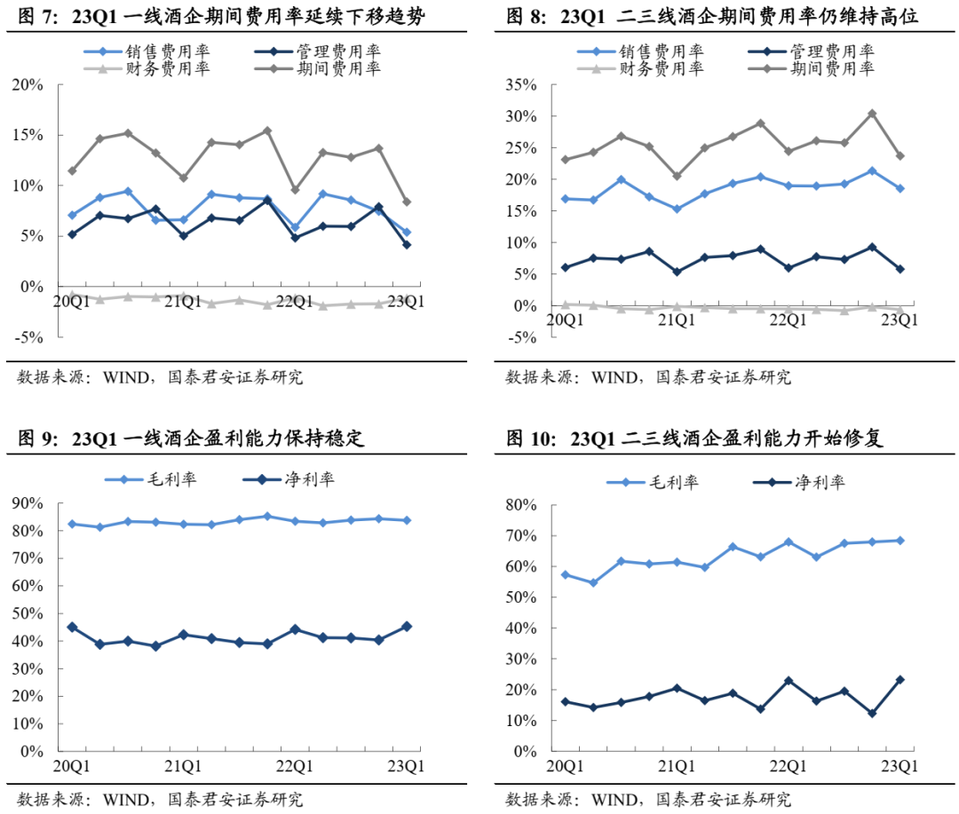 2022年二三线毛利提升显著,2023Q1毛利率平稳运行。2022年板块毛利率同比提升1.34pct,期内一线及二三线白酒毛利率分别同比+0.2pct/4.2pct,二三线白酒结构升级显著。2023Q1板块毛利率80.8%、同比+0.5pct,其中一线及二三线白酒毛利率分别同比+0.3pct/+0.5pct,老窖、古井、今世缘、顺鑫、酒鬼酒等Q1毛利率同比提升显著。22年酒企费用率分化,23Q1复苏驱动板块费用率下移。22年一线酒企费用率同比下降1.4pct,其中销售、管理费用率分别同比下降0.6pct、0.5pct,二三线酒企受外部需求扰动,品牌优势相对弱于头部,22年期间费用率上行1.4pct,其中销售费用占比提升1.6pct;23Q1板块迈入复苏阶段,场景驱动下消费回补,一线酒企及二三线酒企期间费用率均向好,其中一线酒企期间费用率下降1.2pct,销售、管理费用项均有贡献,二三线酒企期间费用率下降0.7pct,主要来自于销售费率下移,但整体看,二三线酒企期间费用率仍维持疫情以来相对高位。综合多因素下,22年板块净利率继续提振,23Q1整体趋势向好。22年一线及二三线酒企净利率分别同比+1.4pct/0.8pct,一线酒企凭借强势地位,毛利率及费用率持续优化驱动净利率提升,二线酒企期间支出较高,但得益于毛利率提振显著,盈利能力亦有改善。23Q1板块整体盈利能力向好,其中一线、二三线酒企23Q1净利率分别同比+1.1pct/+0.3pct。