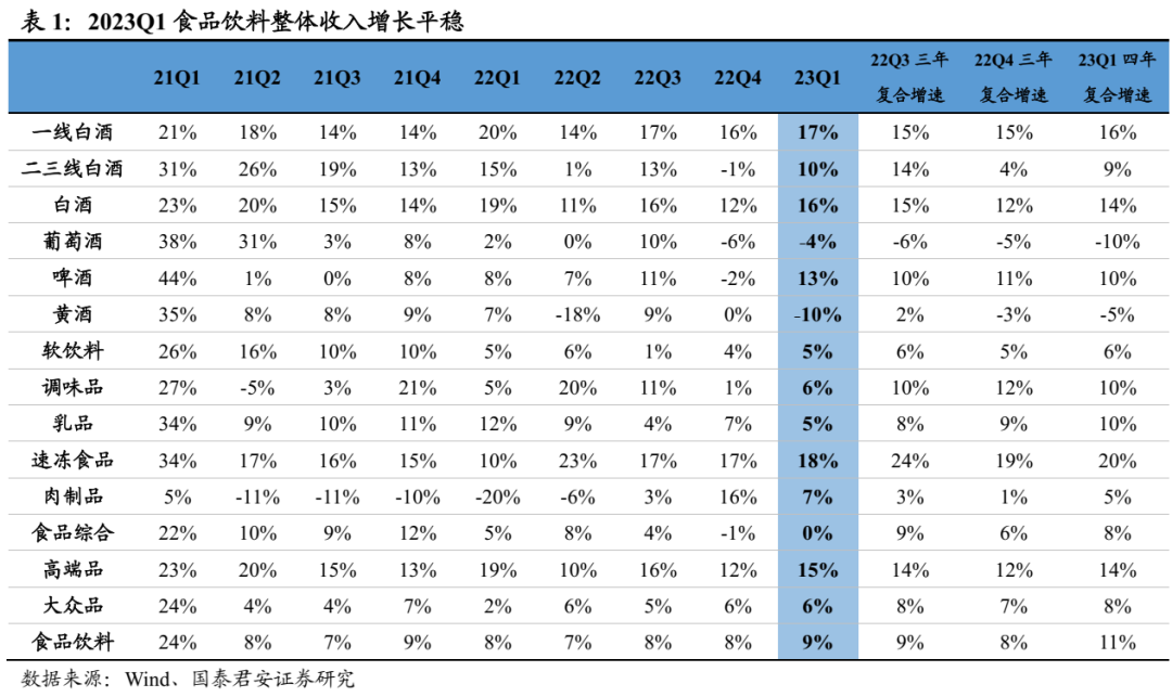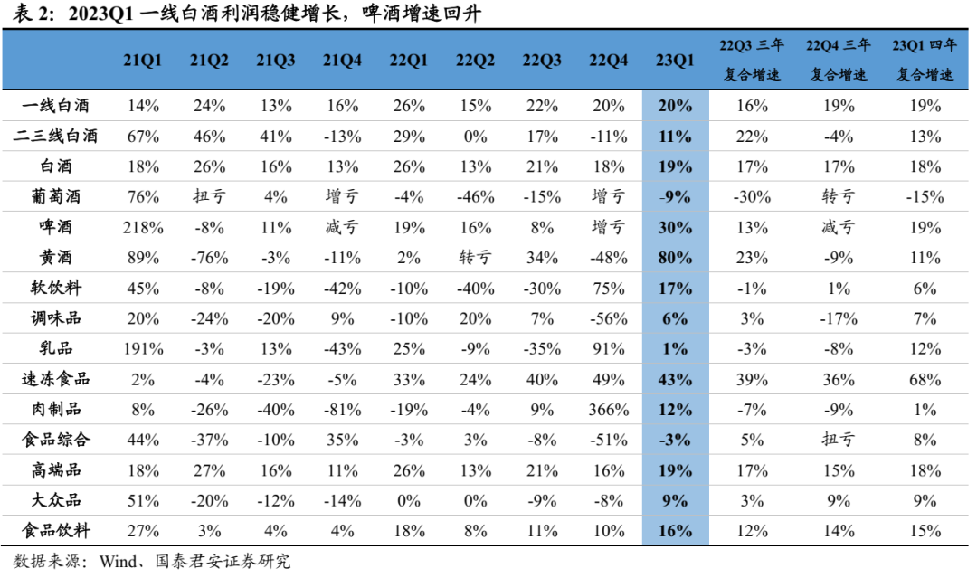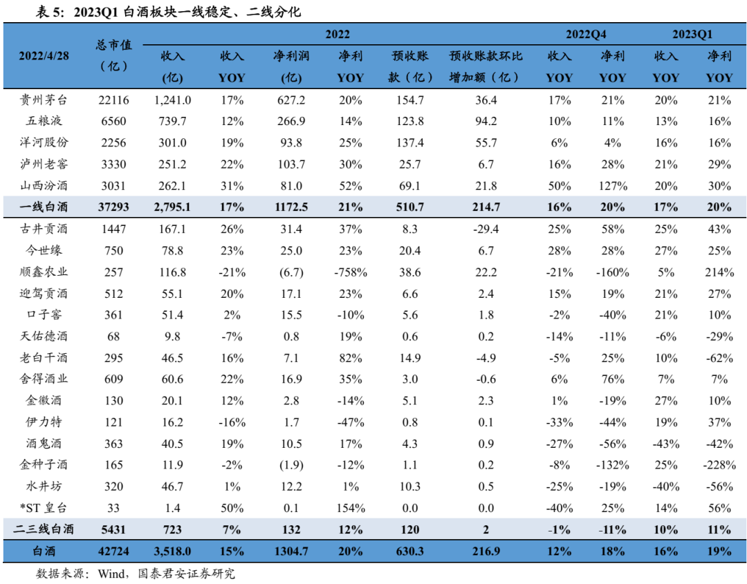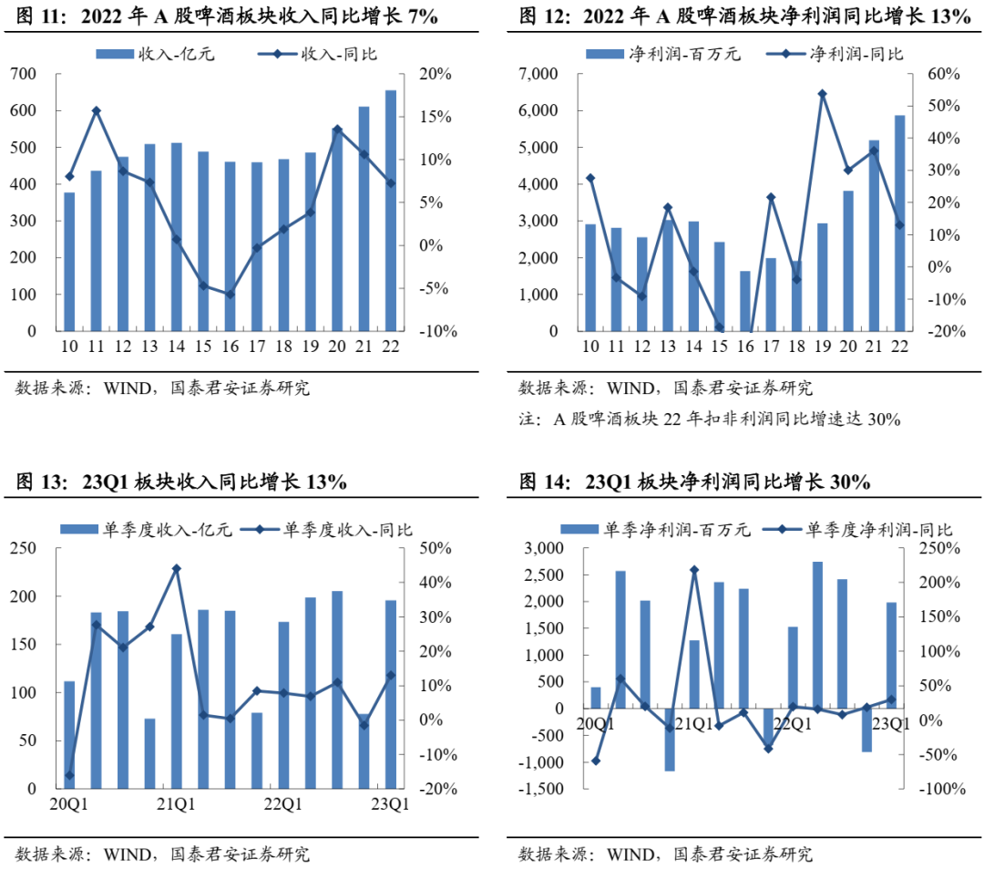 2022年板块延续双位数增长,一线业绩韧性更强,二三线Q4承压且分化。2022年白酒收入+15%、利润+20%,其中Q4单季度收入同比+12%、利润+18%,环比略有降速。分价格带看,一线白酒(茅五泸洋汾,下同)2022年收入+17%、利润+21%,增速快于行业、业绩韧性更强,收入、净利润分别占白酒板块79%、89%, Q4单季度收入+16%、利润+20%,其中茅台、老窖延续增长趋势,茅台Q4收入+17%、利润+21%,老窖Q4收入+16%、利润+28%,五粮液增长相对平稳,Q4收入+10%、利润+11%。汾酒表现最为亮眼,Q4收入+20%、利润+127%,洋河Q4收入+6%、利润+4%略有拖累。二线白酒2022年收入+7%、利润+12%,其中Q4收入-1%、利润-11%,环比降速明显,其中古井收入和利润延续双位数增长,Q4收入+25%、利润+58%,老白干酒、舍得酒业利润端保持双位数增长,舍得Q4收入+6%、利润+76%超市场预期。2023Q1分化显著,高端稳健、次高端承压、区域酒高增。2023Q1白酒板块收入1306亿、净利润535亿,分别同比增长16%、19%,增速同比下降3.7pct、下降7.2pct,短期疫情冲击下逐步筑底。其中,一线白酒收入1052亿,净利润476亿,分别同比增长17%、20%,增速同比下降3.2pct、下降5.7pct,但降幅低于行业整体水平,业绩韧性较强,其中Q1茅台在基数不低情况下仍实现超预期增长,收入+20%、利润+21%,五粮液平稳运行符合预期,老窖收入符合预期、利润+29%超预期,汾酒收入+20%、利润+30%超预期,洋河环比加速。二三线白酒收入253亿,净利润59亿,分别同比增长10%、11%,增速环比改善显著,其中次高端整体承压,舍得收入、利润均增长7%,酒鬼收入、利润高双位数下滑。区域酒相对稳健,收入增长中枢基本保持20%,利润基本保持双位数增长。