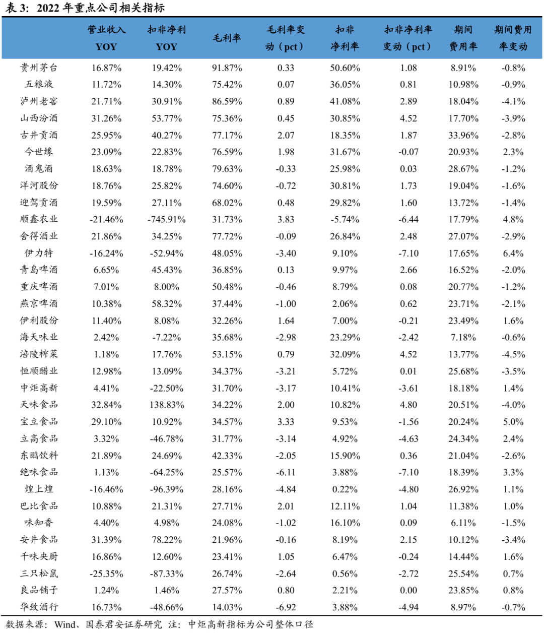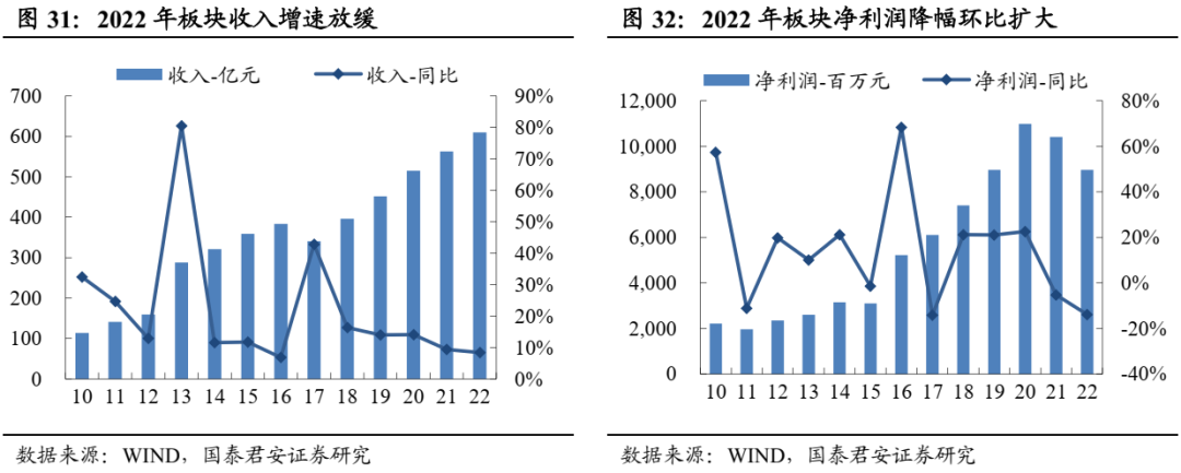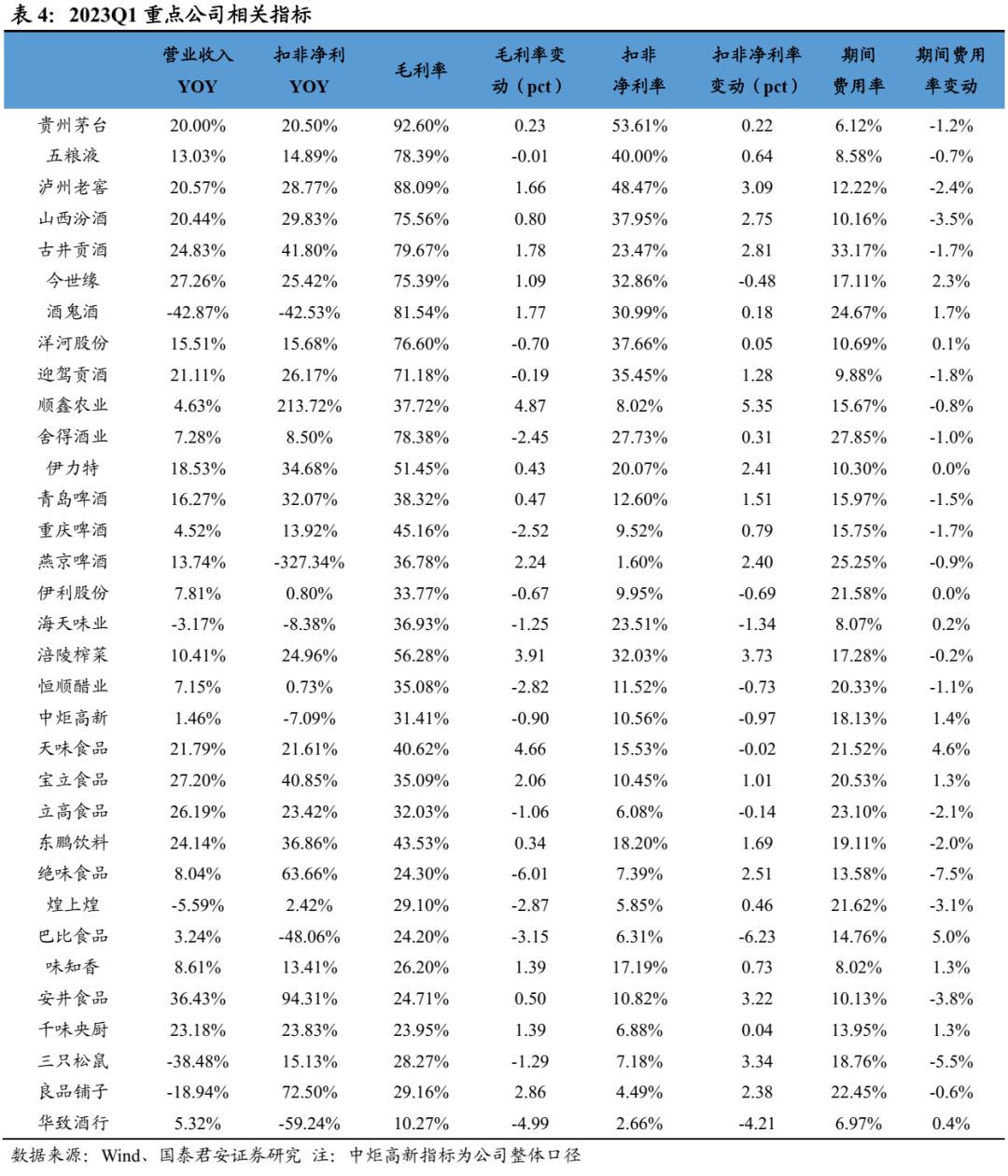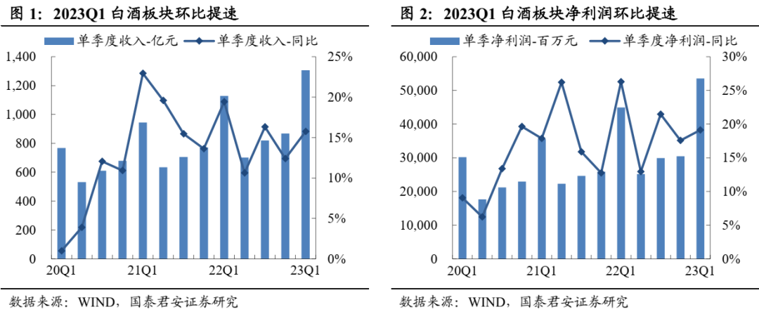 2022年板块延续双位数增长,一线业绩韧性更强,二三线Q4承压且分化。2022年白酒收入+15%、利润+20%,其中Q4单季度收入同比+12%、利润+18%,环比略有降速。分价格带看,一线白酒(茅五泸洋汾,下同)2022年收入+17%、利润+21%,增速快于行业、业绩韧性更强,收入、净利润分别占白酒板块79%、89%, Q4单季度收入+16%、利润+20%,其中茅台、老窖延续增长趋势,茅台Q4收入+17%、利润+21%,老窖Q4收入+16%、利润+28%,五粮液增长相对平稳,Q4收入+10%、利润+11%。汾酒表现最为亮眼,Q4收入+20%、利润+127%,洋河Q4收入+6%、利润+4%略有拖累。二线白酒2022年收入+7%、利润+12%,其中Q4收入-1%、利润-11%,环比降速明显,其中古井收入和利润延续双位数增长,Q4收入+25%、利润+58%,老白干酒、舍得酒业利润端保持双位数增长,舍得Q4收入+6%、利润+76%超市场预期。2023Q1分化显著,高端稳健、次高端承压、区域酒高增。2023Q1白酒板块收入1306亿、净利润535亿,分别同比增长16%、19%,增速同比下降3.7pct、下降7.2pct,短期疫情冲击下逐步筑底。其中,一线白酒收入1052亿,净利润476亿,分别同比增长17%、20%,增速同比下降3.2pct、下降5.7pct,但降幅低于行业整体水平,业绩韧性较强,其中Q1茅台在基数不低情况下仍实现超预期增长,收入+20%、利润+21%,五粮液平稳运行符合预期,老窖收入符合预期、利润+29%超预期,汾酒收入+20%、利润+30%超预期,洋河环比加速。二三线白酒收入253亿,净利润59亿,分别同比增长10%、11%,增速环比改善显著,其中次高端整体承压,舍得收入、利润均增长7%,酒鬼收入、利润高双位数下滑。区域酒相对稳健,收入增长中枢基本保持20%,利润基本保持双位数增长。