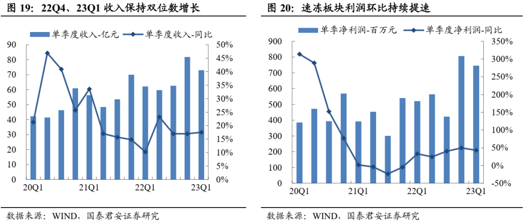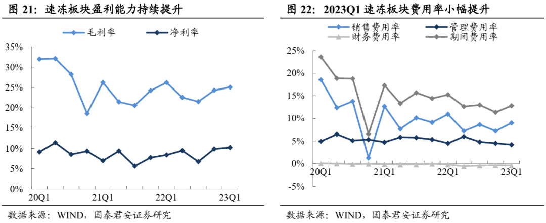 盈利改善趋势延续。2022年速冻食品板块毛利率23.7%、同比+0.4pct,下半年起成本压力缓解,销售费用率同比-1.5pct、管理费用率同比-0.5pct,费用优化下板块最终净利率同比+1.3pct至8.7%,盈利提升明显。2023Q1速冻食品板块毛利率25.1%、同比+0.8pct,延续改善趋势,销售费用率同比+0.4pct、管理费用率同比+1.8pct,巴比净利高增带动下Q1板块净利率同比+0.4pct至10.2%。