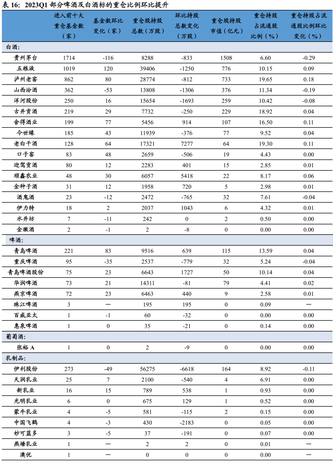 分板块看重仓比例变动方向分化,啤酒部分企业2023Q1公募重仓比例环比提升,白酒及其他大众食品类整体分化。