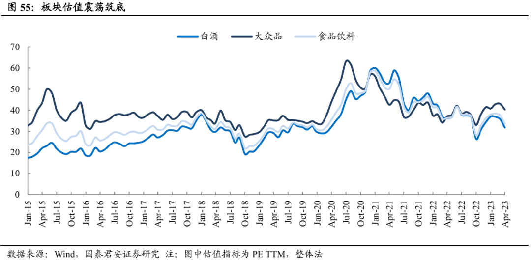 板块分化加剧,估值筑底。食品饮料板块的PE-TTM估值震荡筑底,截至2023年4月28日,行业整体PE-TTM为33.7X,其中白酒板块整体PE为31.8X,大众品板块整体PE为40.3X。白酒估值下行较大众品更为明显。我们认为,从估值角度来看,短期对消费复苏节奏和斜率的预期扰动已逐步反映,估值震荡筑底。
