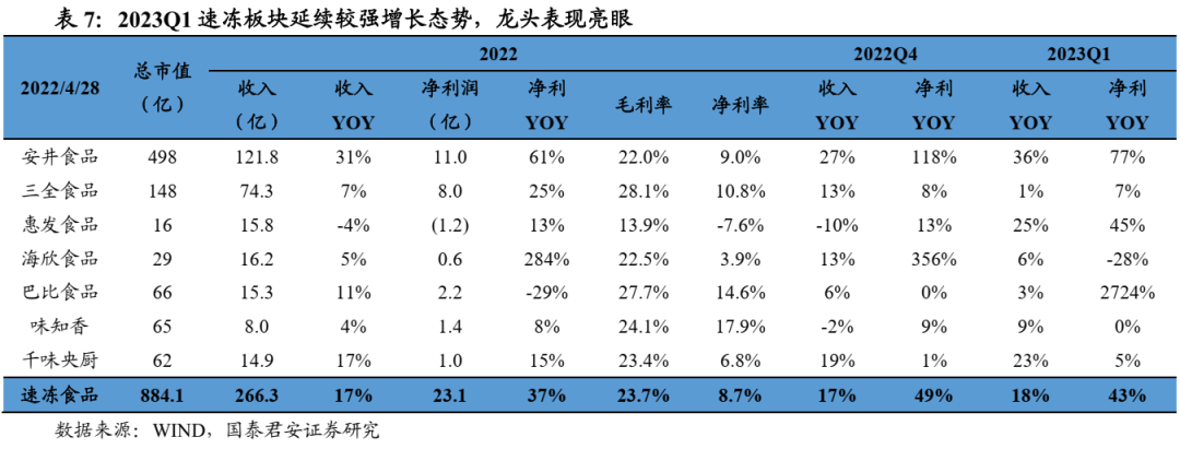 2022年收入、利润双位增长,利润快于收入。2022年速冻食品板块收入251亿元,同比+17%,其中龙头安井主业2022年收入同比+31%延续高增、领跑行业,巴比食品、千味央厨2022年分别同比+11%、17%,均录得双位数增长;速冻食品板块整体利润为22亿元,同比+37%,其中海欣净利润同比+284%,除巴比、味知香外其余公司净利润均同比实现双位数增长,巴比主要系间接持股东鹏影响。2023Q1收入双位数增长,利润提速显著。2023Q1速冻食品板块收入73亿元,同比+18%,其中安井食品并表增厚叠加复苏发力同比+36%,三全收入同比持平,惠发食品、千味央厨收入均双位数增长,分别同比+25%、+13%。2023Q1速冻食品板块整体利润为7.45亿元,同比+43%,利润提速显著,中安井同比+77%、三全+7%、惠发+45%、千味央厨+5%,海欣利润、巴比扣非利润Q1下滑、味知香Q1利润持平。