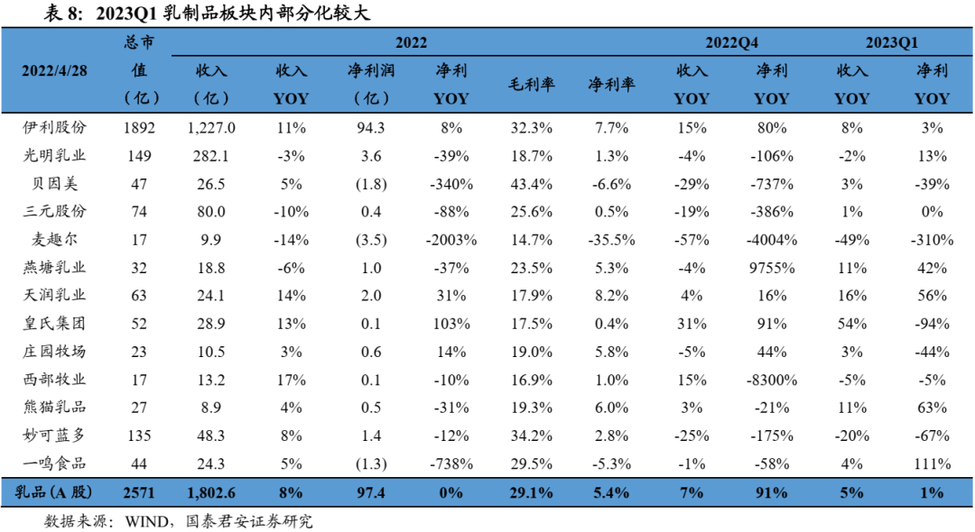 1Q23液奶景气度有所回升,伊利奶粉维持高利润率。2022乳制品板块(A股)收入1988亿、同比+7%,净利润92亿元、同比-18%。2023Q1乳制品板块(A股)单季度收入477亿元、同比+5%,净利润40亿元、同比+1%。液奶景气度有所回升,奶粉集中度提升,伊利奶粉业务1Q23内生收入高个位数增长,且净利率达+30 %。毛利率趋于稳定,销售费率环比下降。2023Q1乳制品板块(A股)毛利率同比下降0.6pct至30.5%。伊利、蒙牛1Q23毛利率微幅收缩,整体成本压力趋缓,预计2023年毛利率会保持相对稳定。2023Q1板块平均销售费用率为16.2%,环比下降0.9pct,同比下降1.2pct,竞争格局优化,伊利费效比提升,其1Q23 销售费用率下降1.1pct。2023Q1板块净利率同比下降0.3pct至8.4%。