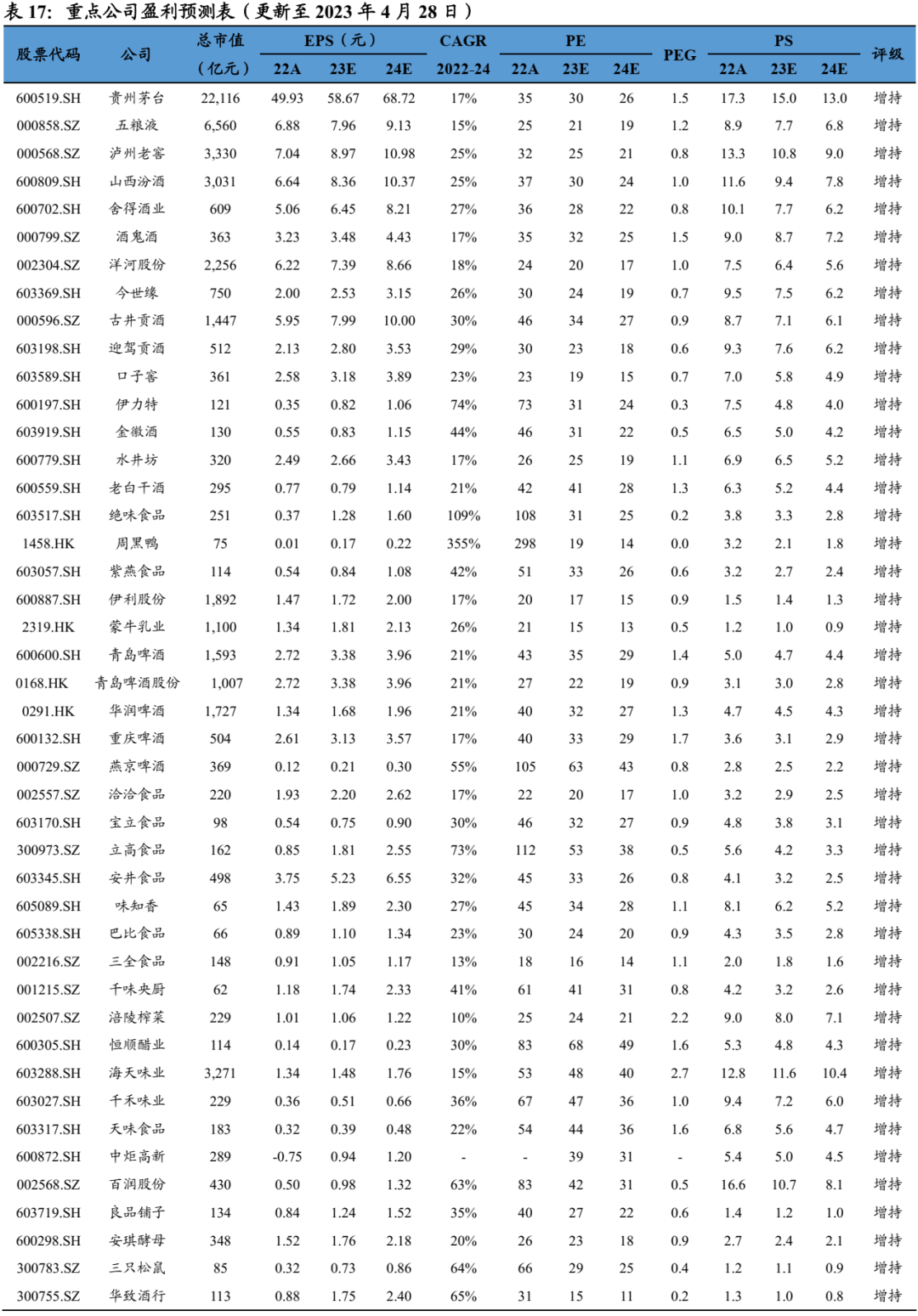 白酒:量在价先,逐步复苏。2023年春节在消费需求释放及春节旺季返乡礼赠、聚餐等因素的驱动下,白酒动销超出预期。节后商务、宴席、日常聚餐将接力春节消费,五一宴席积极、场景修复延续。我们判断上半年场景修复、下半年消费力恢复,从而形成上半年强量弱价的情况,下半年随着消费力恢复,批价有望上行。建议增持:1)低估值及确定性标的:贵州茅台、山西汾酒、古井贡酒、泸州老窖、五粮液、迎驾贡酒、今世缘、洋河股份等;2)下半年布局次高端标的:老白干酒、酒鬼酒、水井坊、舍得酒业等。
