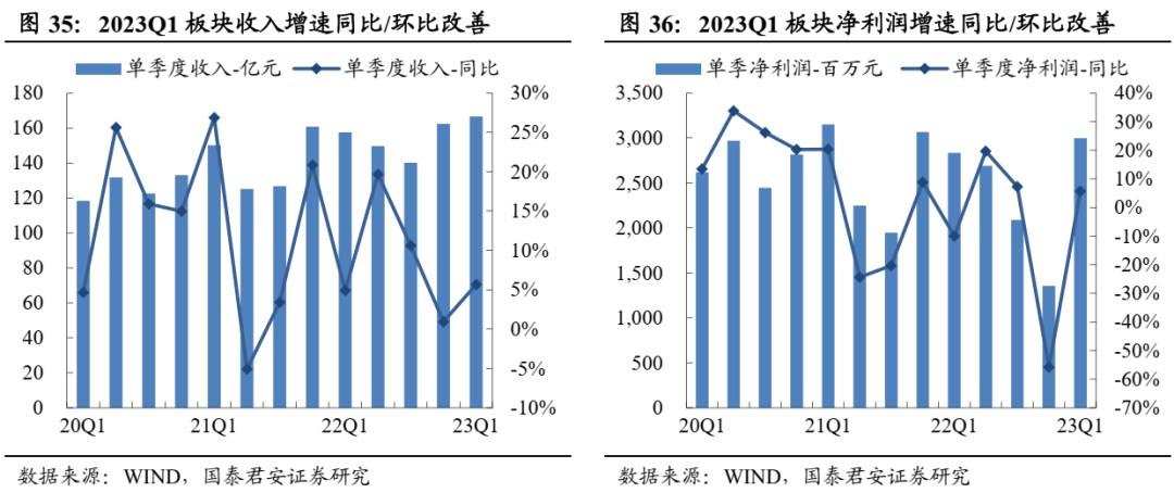 食品饮料板块复苏,内部分化延续。2022年食品饮料板块收入10659亿元、同比+7.8%,净利润1809亿元、同比+12.2%,22Q4单季收入+7.7%、净利润+10.3%。23Q1板块收入同比+9.5%,净利润同比+16.3%。板块整体呈复苏态势,高端韧性凸显,大众品分化延续。