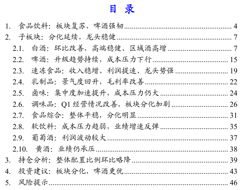 导读:白酒高端韧性较强,区域龙头相对稳健,次高端仍承压;啤酒升级趋势不变、动销明显加速;大众品成本压力部分缓解,分化趋势延续,速冻保持高增、盈利改善。