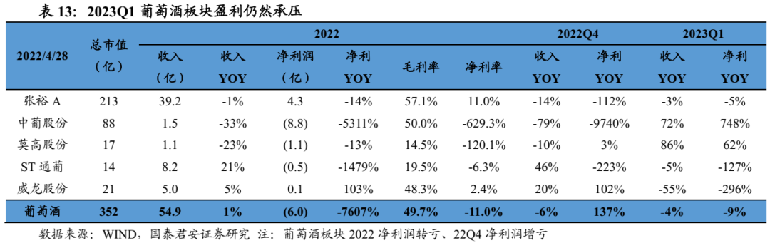 葡萄酒板块业绩仍承压。2022年葡萄酒板块收入55亿元、同比+1%,归母净利润-6亿元、同比转亏,主因22Q4部分公司利润端表现不佳拖累全年盈利。2023Q1板块收入16亿元、同比-4%,归母净利润2.6亿元、同比-9%。23Q1板块毛利率51.0%、同比-2.9pct,期间费用率25.8%、同比+0.2pct,净利率16.6%、同比-0.9pct。