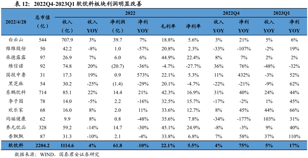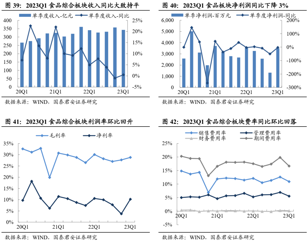 大众品:1)啤酒:升级趋势持续,成本压力大幅缓解。22年A/H股啤酒收入1008亿元、同比+7%,扣非核心净利润97亿元、同比+28%。23Q1(A股)板块收入+13%、净利润+30%,已披露公司总销量+10%、吨价+3%,结构升级趋势不变。2)速冻:收入稳增、利润提速、龙头势强。22年板块收入251亿元、同比+17%,净利润22亿元、同比+37%,23Q1收入+18%、净利润+43%提速显著,主要受益于成本下降及费用优化。3)乳制品:景气度回升,毛利率改善。22年板块收入1988亿、同比+7%,净利润92亿元、同比-18%,23Q1收入+5%、净利润+1%,液奶景气度回升。4)调味品:Q1经营情况改善,板块分化加剧。22年板块收入610亿元、同比+8%,净利润89.7亿元、同比-14%;23Q1收入+6%、净利润+6%,场景复苏及成本下行驱动业绩改善。5)卤味:边际改善,成本压力仍大。22年A股休闲卤制品板块收入122亿元、同比+1.7%,净利润4.3亿元、同比-70%,23Q1收入+6.8%、净利润+43.8%,行业成本压力仍在。