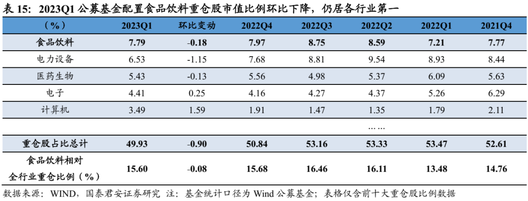 食品饮料板块23Q1获公募基金重仓配置比例环比略降。从公募基金重仓股配置比例来看,2023Q1食品饮料重仓股配置比例环比下降0.18pct至7.79%,在各行业中仍位居第一。