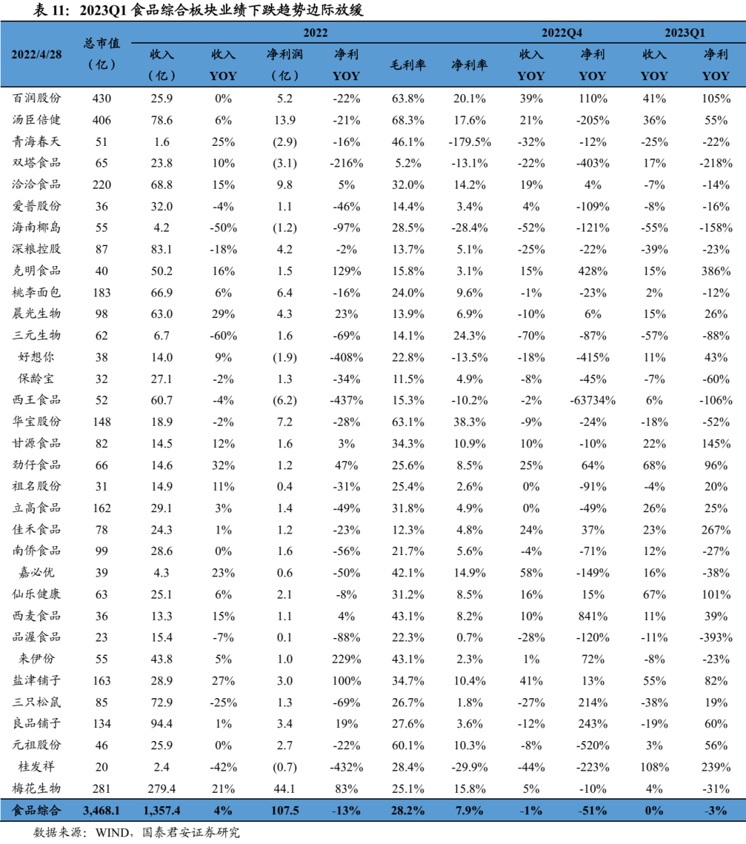食品综合板块收入增速整体放缓,盈利增速承压。2022年食品综合板块收入1357亿元、同比+4%,归母净利润107亿元、同比-13%,其中2022Q4收入和净利润分别-1%、-51%。2023Q1板块趋势边际向好,收入343亿元、同比大体持平,归母净利润35亿元、同比-3%,增速均环比提升。受成本端影响边际式微影响,食品综合板块利润率止跌回升,2023Q1毛利率28.8%、同比-1.3pct、环比+1.1pct,板块净利率10.2%、同比-0.3pct、环比+6.5pct。其中,百润股份受益于旗下强爽显著放量,22Q4以来收入、利润保持高速增长;甘源食品、劲仔食品、盐津铺子等受益于新业态崛起以及同期低基数,收入增长仍较为迅猛,继续释放利润弹性。