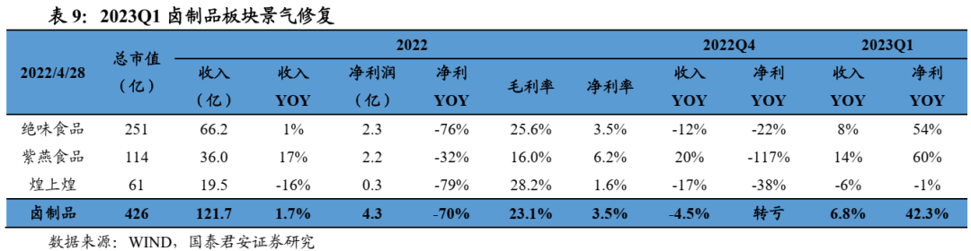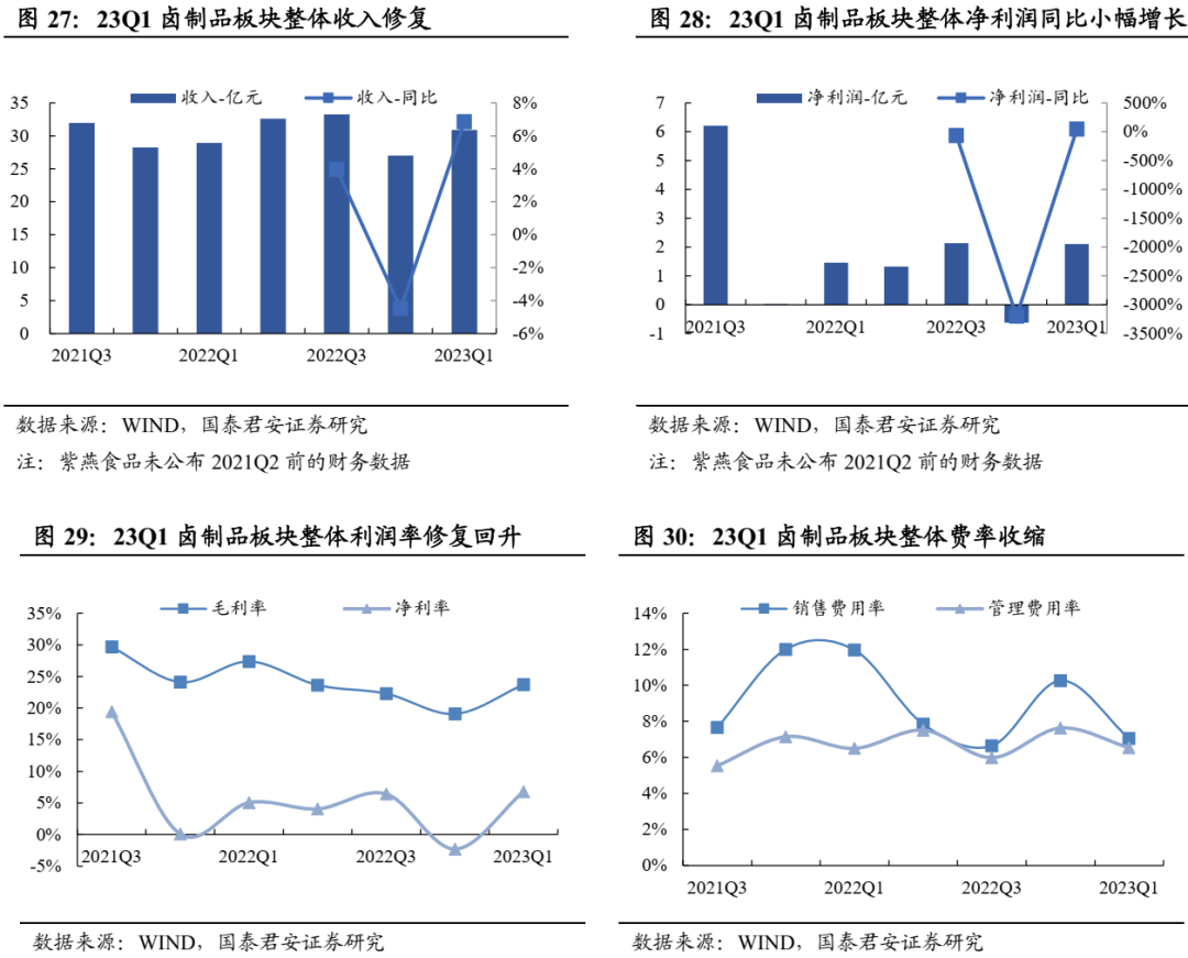 1Q23餐卤收入迎来回升,净利润同比扭亏。2022全年休闲卤制品板块(A股)收入122亿元、同比上涨1.7%,净利润4.3亿元、同比下降70%。1Q23单季度收入、净利润分别同比上涨6.8%、43.8%。据调研,1Q23绝味净开店700-800家(增速10%),紫燕开店100多家(增速8-10%)。1Q23绝味单店同比下降4%左右,紫燕单店同比增长4-6%。1Q23成本端承压,销售费用率有效收缩。1Q23休闲卤制品板块(A股)毛利率23.7%、同比下降3.7pct,主因受到成本压力影响,净利率6.8%、同比上涨1.7pct。销售费用率7.1%、同比收缩4.9pct,管理费用率6.5%、同比微涨0.04pct。紫燕食品1Q23毛利率同比+2.33pct至18.69%,主因牛肉价格降至2021年水平,公司1Q23销售费率、管理费率同比小幅上涨0.3pct、0.3pct至4.5%、6.5%。