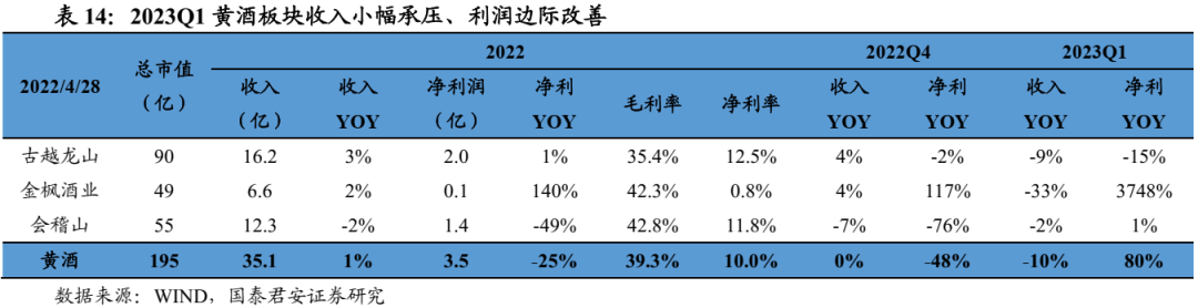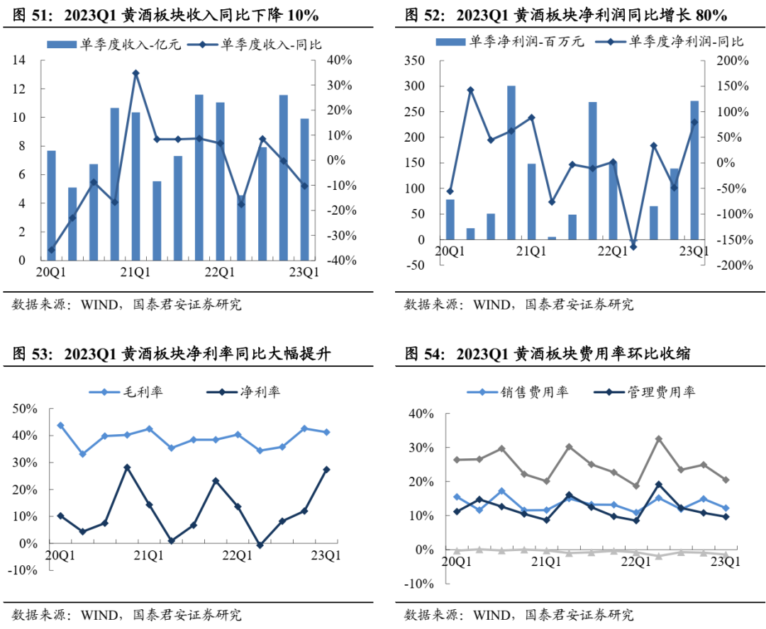 黄酒板块收入增速放缓,利润改善主因部分公司收到大额补偿。2022年黄酒板块收入35亿元、同比+1%,归母净利润3.5亿元、同比-25%。2023Q1收入10亿元、同比-10%,归母净利润2.7亿元、同比+80%,板块毛利率41.2%、同比+0.8pct、环比-1.4pct,净利率27.3%、同比+13.7pct、环比+15.3pct。费用率方面,2023Q1板块销售费率大体持平、管理费率环比收窄,整体期间费用率20.5%、同比+1.8 pct、环比-4.4pct。黄酒板块中,23Q1金枫酒业归母净利取得亮眼增长主因收到2亿元的房屋征收补偿款,剔除该部分收益影响后,板块利润增速不佳。