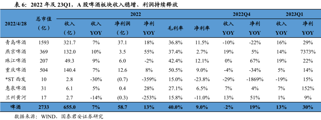 动销明显加速,吨价持续提升。2022年A股啤酒板块收入655亿元,同比增长7%;归母净利润59亿元,同比增长13%;扣非净利润52亿元,同比增长30%。若将港股华润啤酒纳入统计口径,2022年啤酒板块实现营收1007.6亿元,同比增长6.7%;实现扣非核心净利润97.4亿元,同比增长28.3%。22Q4单季A股啤酒板块收入78亿,同比下降2%;扣非净利亏损9.8亿元,同比减亏3.3亿元。23Q1单季A股啤酒板块实现收入196亿,同比增长13%,增速同比+5pct、环比+15pct;归母净利润20亿元,同比增长30%;扣非归母净利18.5亿元,同比增长34%。拆分量价来看,2022年啤酒板块(A股+华润啤酒)总销量2747万吨、同比增长1.6%,吨价3424元、同比+4.9%;23Q1单季A股啤酒板块(不含未披露销量的兰州黄河、ST西发)总销量446万吨、同比增长10%,实现淡季不淡、动销明显加速,吨营收同比+3.0%,部分公司淡季货折短期有所加大,吨价增速预计逐步恢复,结构升级趋势不变。