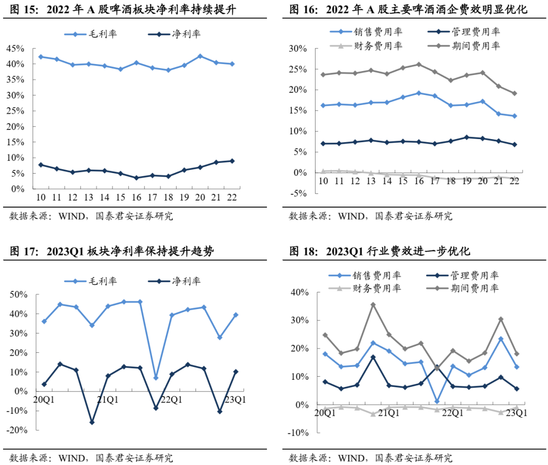 成本逐步下行,毛销差扩张可期。2022年A股啤酒板块毛利率40.0%、同比-0.5pct,23Q1单季毛利率39.4%、同比+0.1pct,22年毛利率同比下滑主因包材及原料成本处于高位(主要公司吨成本涨幅均在中个位数及以上),23Q1毛利率已现改善趋势,我们预计随着主要包材成本进入下行区间,成本压力有望明显缓解,反映至毛利率将进一步改善。费用方面,2022年A股啤酒板块销售费用率13.7%、同比-0.5pct,23Q1单季板块销售费用率13.4%、同比-0.3pct;22年板块管理费用率6.8%、同比-0.9pct,23Q1单季板块管理费用率5.8%、同比-0.8pct;行业格局稳定背景下,销售费效比提升以及管理效率改善带来费率优化。A股啤酒板块22年净利率同比+0.5pct至9.0%,23Q1净利率同比+1.3pct至10.1%。我们预计结构升级带动吨价持续提升、包材成本下带来吨成本改善,板块盈利有望持续优化。