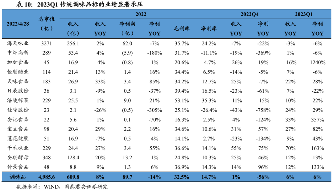 场景受限+成本上行导致板块2022年经营承压。2022年调味品板块实现营业收入610亿元,同比+8%,增速环比略有放缓,实现归母净利润89.7亿元,同比-14%,降幅环比扩大,毛利率/净利率分别为32.5%/14.7%,同比-2.3pct/-3.8pct,盈利能力承压主因大豆等成本价格显著上行,2022年期间费用率为12.7%,同比-0.8pct。总体而言,受餐饮等消费场景受限导致销量承压以及成本上行压力所拖累,调味品板块2022年经营承压。
