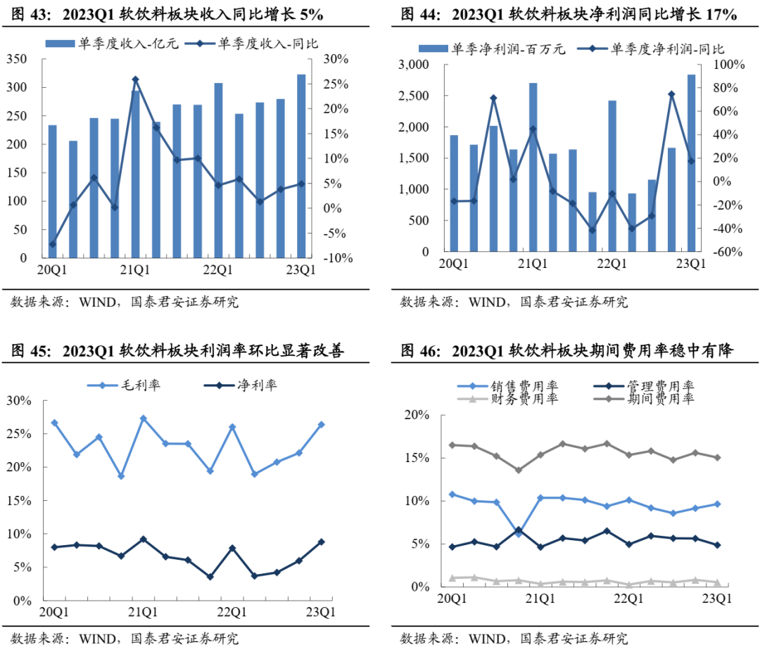 软饮料板块收入、利润增速触底反弹,盈利能力修复。2022年软饮料板块收入1115亿元、同比+4%,增速同比放缓,实现归母净利润62亿元、同比-10%,其中2022Q4收入280亿元、同比+4%,归母净利润17亿元、同比+75%。2023Q1板块收入323亿元、同比+5%,增速同比提升0.3pct,归母净利润28亿元、受益于低基数增速+17%(22Q1增速为-10%)。一方面随着终端需求陆续恢复,另一方面PET瓶、瓦楞纸等原材料价格回落至相对低位,22Q4以来软饮料板块利润端环比改善趋势明显,带动盈利能力回升,截至2023Q1板块毛利率26.4%、同比+0.4pct、环比+4.3pct,期间费用率15.1%、同比环比均小幅改善,推动净利率回升至8.8%、同比+0.9 pct、环比+2.8pct。