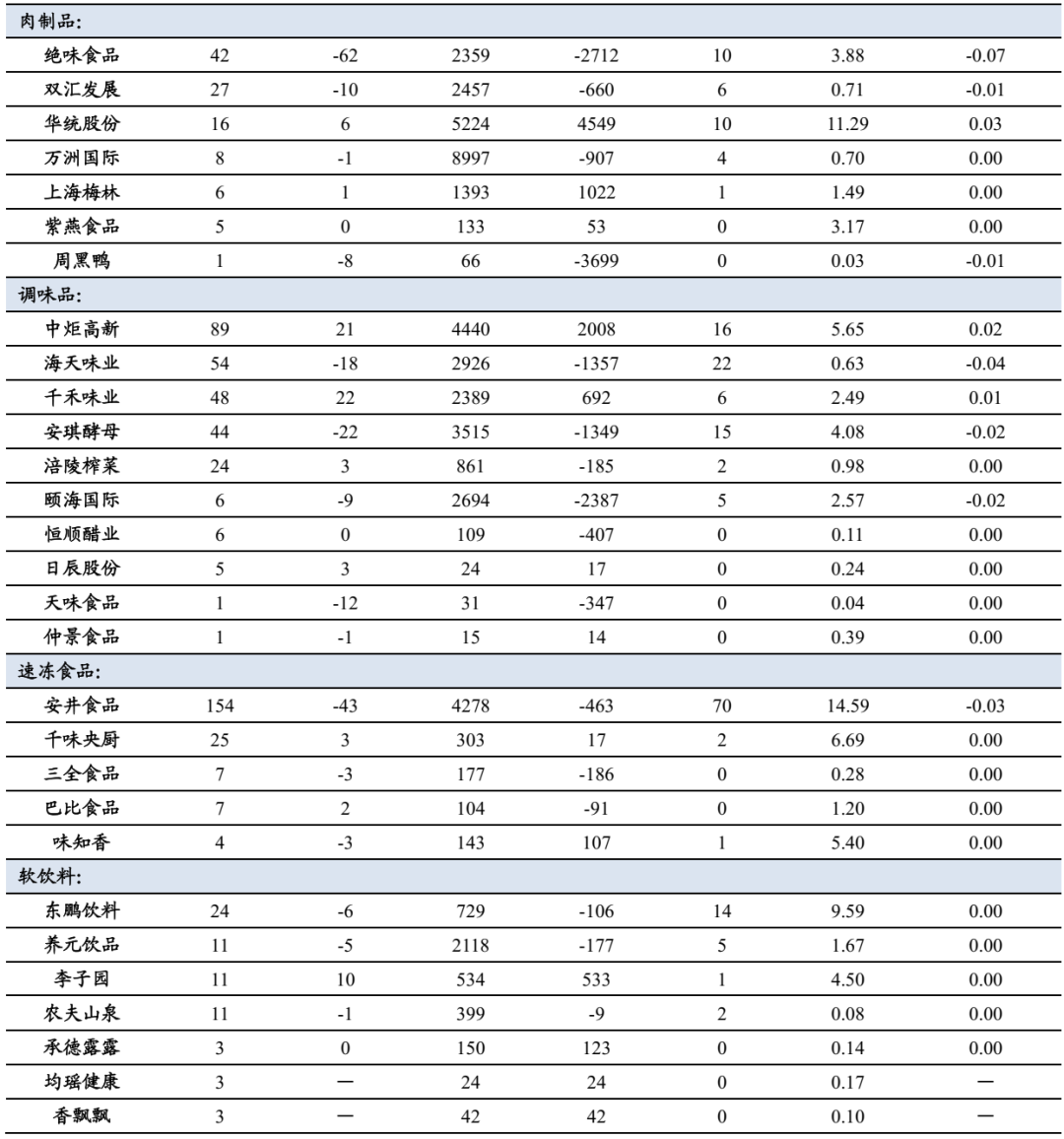 白酒板块:舍得酒业、老白干酒、迎驾贡酒、顺鑫农业、金种子酒、伊力特的公募重仓持股比例不同程度提升。啤酒板块:青岛啤酒、青岛啤酒股份、燕京啤酒、珠江啤酒等头部啤酒公司重仓比例均有所提升。乳制品板块:新乳业、光明乳业重仓比例上升,伊利股份、蒙牛乳业、天润乳业、中国飞鹤、妙可蓝多重仓比例有所下降。肉制品板块:华统股份、上海梅林、紫燕食品重仓比例上升,绝味食品、双汇发展、万洲国际、周黑鸭等重仓比例不同程度下降。调味品板块:中炬高新、千禾味业、日辰股份、仲景食品重仓比例有所提升。速冻食品板块:千味央厨、味知香重仓比例上升,安井食品、三全食品、巴比食品重仓比例下降。软饮料板块:李子园、承德露露等重仓比例提升。食品综合板块:甘源食品、盐津铺子、劲仔食品、汤臣倍健等重仓比例不同程度提升。