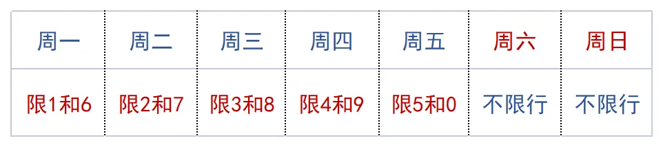 限行规则:按机动车号牌(含临时号牌和外地号牌)最后一位阿拉伯数字,工作日每天限行两个号。