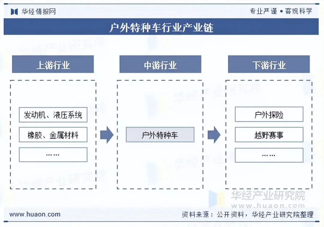 产业链方面,上游为原材料与核心零部件供应环节,涉及金属材料(特种钢、铝合金等)、橡胶、工程塑料,以及发动机、越野底盘、车桥、液压系统等零部件;中游为户外特种车整车制造环节,涵盖了采购、组装、检测等流程;下游为应用环节,主要硬要把关于户外探险、越野赛事等领域。