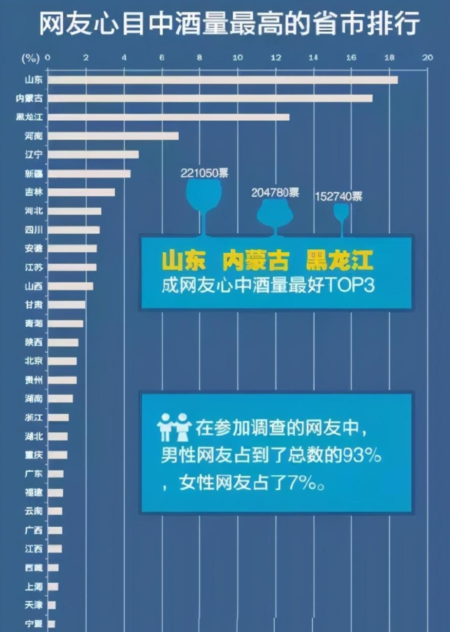但是喝酒的人可有大不同,有的人爱喝却不能喝,有的人能喝却不爱喝;有的人千杯不醉,有的人一杯就倒。也许在许多人眼中,东北人出了名的能喝,根据某机构调查的数据,在“网友心目中酒量最高省市排行中”,山东力压内蒙古和哈尔滨,成为了中国最能喝的省份。