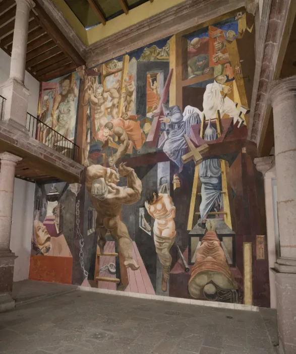 20世纪30年代,加斯顿身处美国激进的社会与政治环境中。在洛杉矶,他曾亲眼目睹三K党在大街上公然游行,这种深刻的恐惧成为他参与壁画创作的推手。他从乔治·德·基里科、萨尔瓦多·达利和墨西哥壁画,甚至是文艺复兴时期的古典画作中获取灵感,与另一位年轻艺术家在墨西哥共同创作的巨幅壁画《反战与反法西斯斗争》,用极具力量的线条控诉战争暴行。