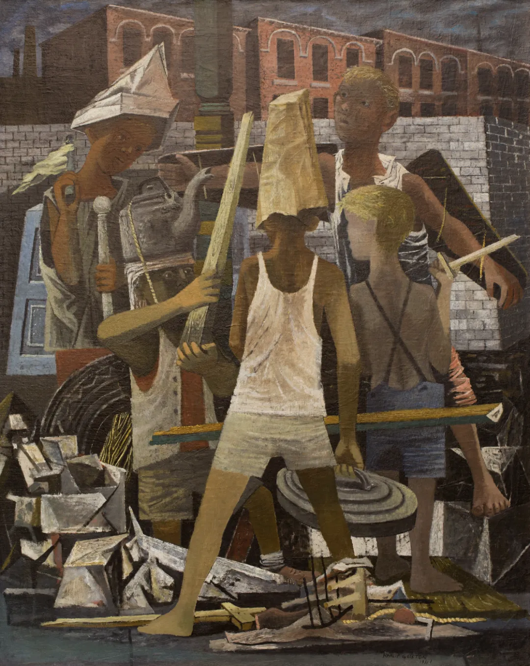 但40年代移居中西部任教后,他的目光开始缩回私人场域。《好斗的记忆》中戴着纸面具、手持木棍嬉戏的孩子,不再是口号式的政治符号,而是关于创伤与伪装的私人寓言。