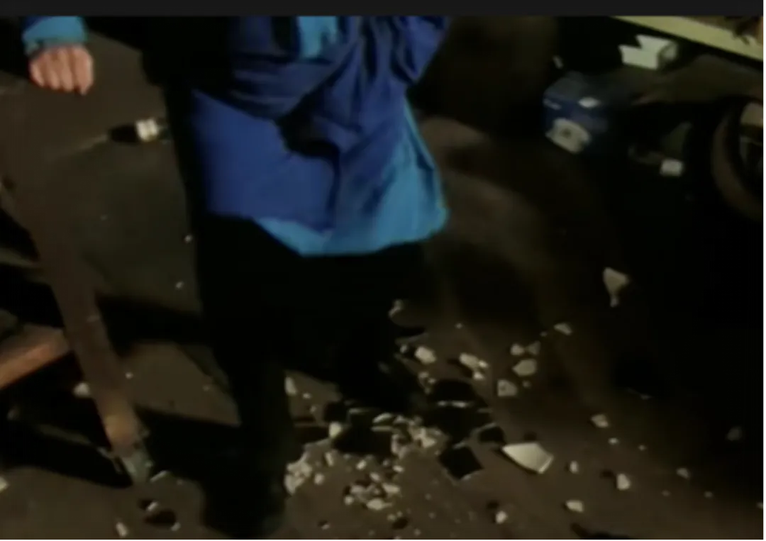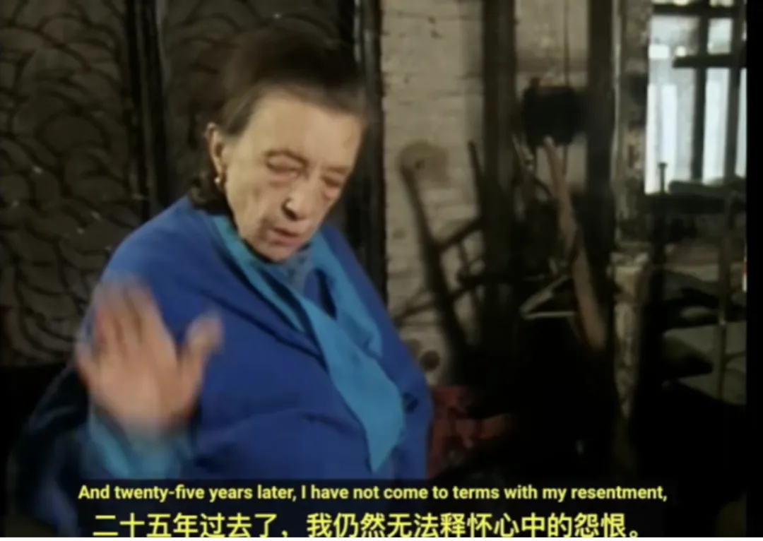 路易斯·布尔乔亚在采访视频中,谈到父亲时怨恨地踩向作品碎片