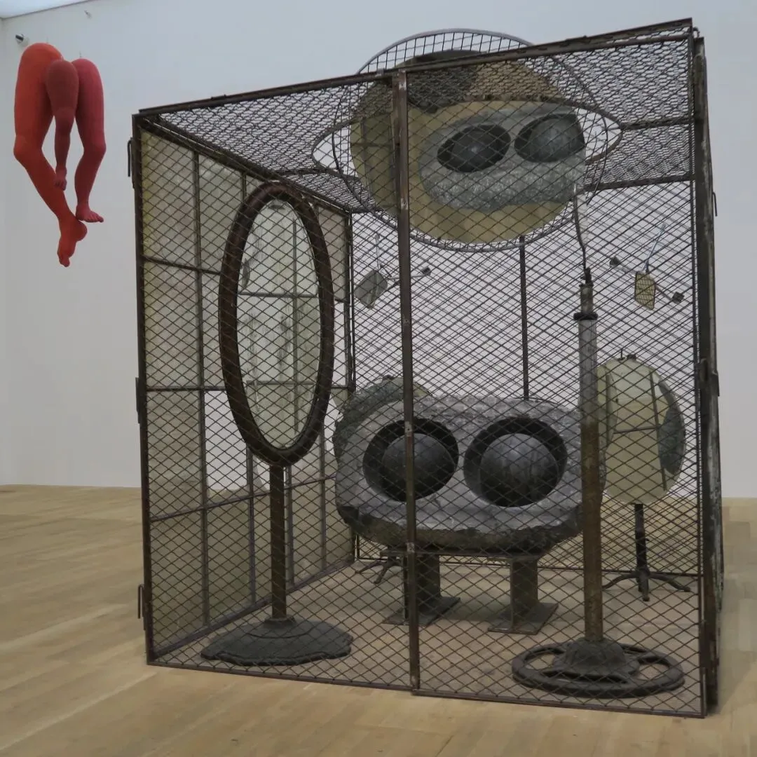 然而,随着时间的推移,以及心理历程的转变,镜子不再是她的敌人,成为一种反射欲望与痛感的装置。《牢房(眼睛与镜子)》是她早期创作的牢房作品之一。笼子内部摆放着一块粗糙的大理石,它的“眼睛”向上凝视着巨大的圆形镜子。四周的镜子像是梳妆镜,令人联想到家的感觉。