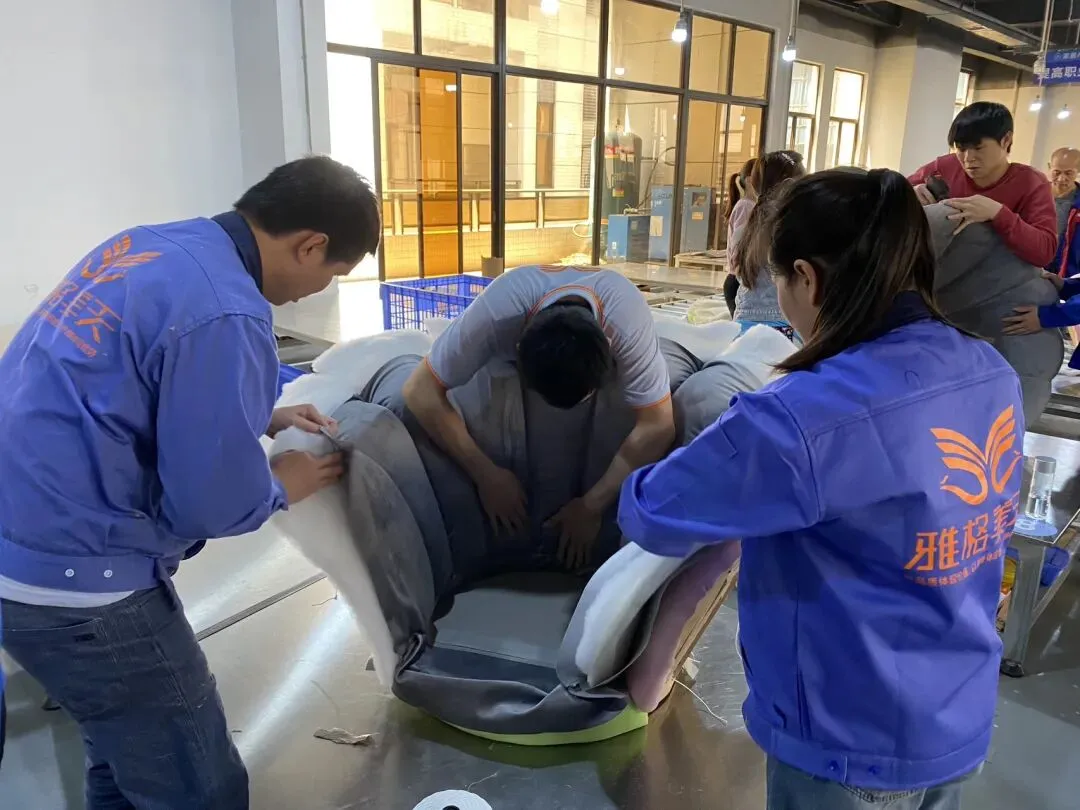 比赛现场,各专项赛场选手凝神聚力、各展所长,上演了一场精彩的技能比拼。车裁选手手持工具,精准测量、利落裁剪、娴熟车缝,每一道线路都平直均匀;架棉选手精心塑形、精准填充,让海绵与框架完美契合,筑牢家具结构根基;扪工选手巧手翻飞,细腻拉伸面料、精致处理边角,将原料雕琢成兼具质感与美感的半成品。