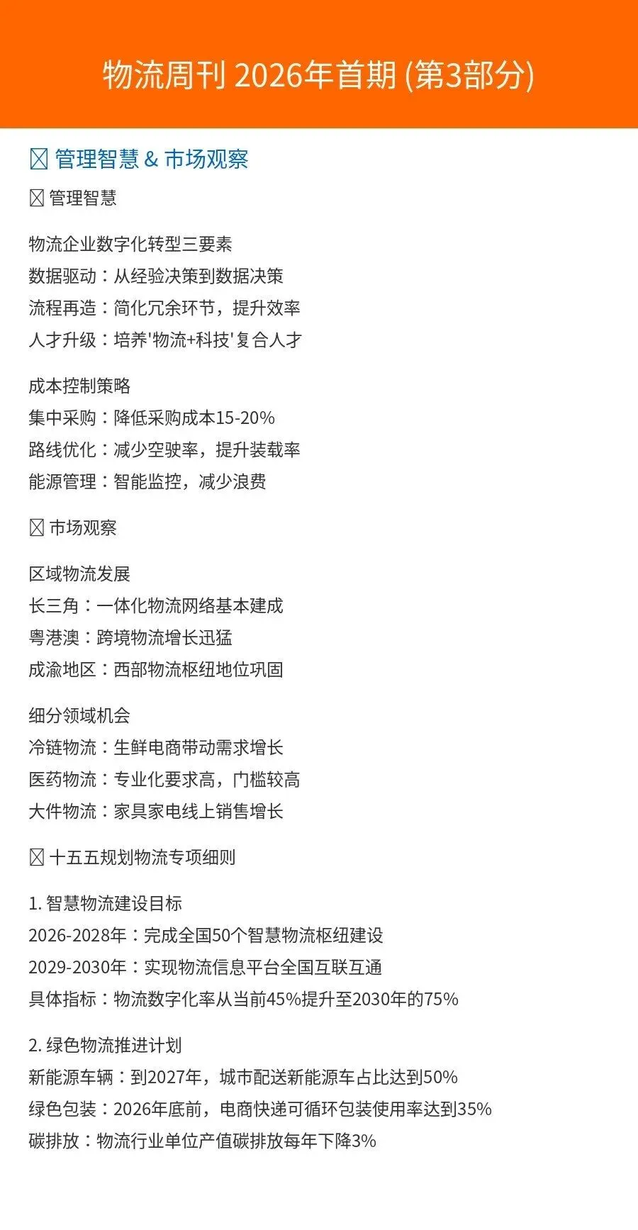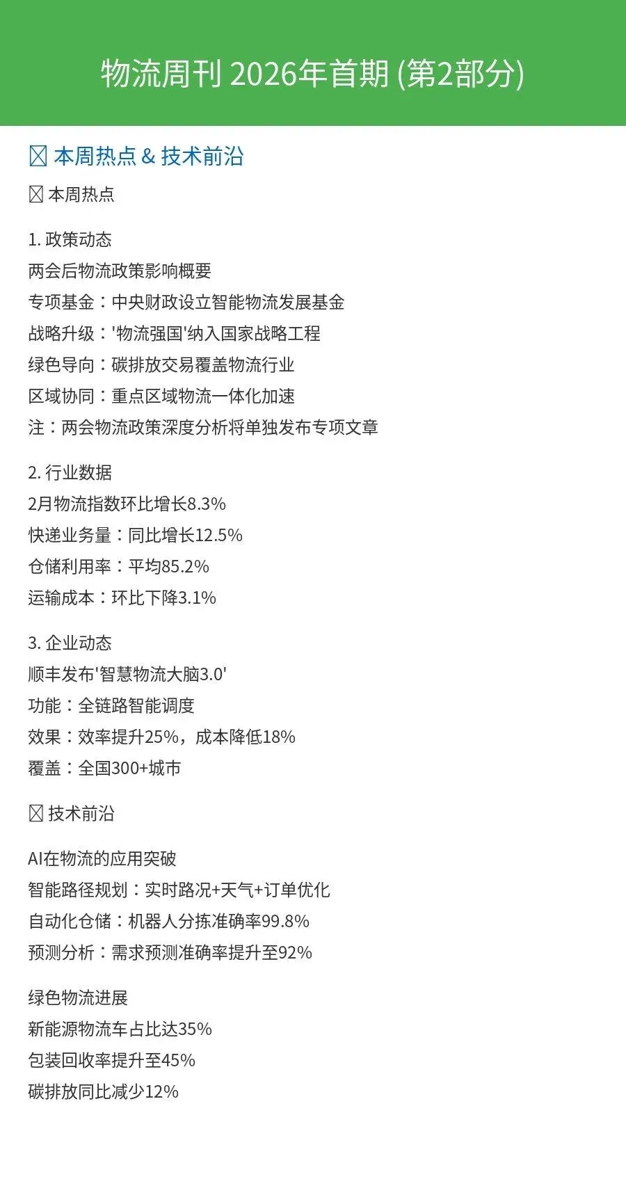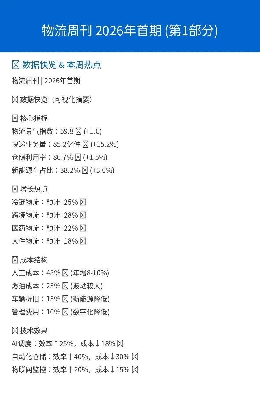 本期周刊聚焦企业核心关切:- 景气度与市场判断:物流景气指数59.8、快递业务量85.2亿件等核心指标,帮助企业快速判断行业复苏节奏,合理规划运力与仓储布局;- 高增长赛道挖掘:跨境物流(+28%)、冷链物流(+25%)等热点领域数据,为企业拓展新业务、布局细分市场提供精准参考;- 成本优化方案:拆解人工、燃油、折旧等成本结构,结合新能源替代、数字化管理等实践,为企业降本增效提供可复制路径;- 技术赋能落地:AI调度、自动化仓储等技术效果量化呈现,搭配顺丰“智慧物流大脑3.0”等企业案例,帮助企业评估技术投入回报,加速智能化升级;-政策红利捕捉:智能物流发展基金、“物流强国”战略等政策动态,助力企业提前布局绿色低碳、区域协同等政策利好方向。《物流周刊》将持续以专业、务实的内容,成为物流企业的“决策参谋”。首期内容已全面上线,欢迎企业管理者、行业从业者阅读,共探2026物流增长新机遇。