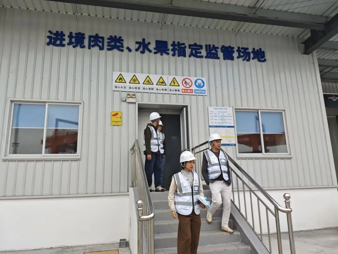随后第二站,走访团来到江门高新港务发展有限公司。李敏副总经理热情接待了走访团一行。双方首先进行了简短座谈,了解港口近期吞吐量、航线拓展及智慧港口建设情况。在港务公司李总的引导下,代表团深入码头前沿,实地参观了高效运转的集装箱作业区。紧接着,走访团重点考察了进境肉类、水果指定监管场地,详细了解了冷链集装箱的查验流程、仓储温控标准及通关便利化措施。邓会长表示,高新港务作为江门外贸的重要门户,其完善的冷链查验设施为江门及周边地区进口优质肉类水果提供了有力保障,协会将积极引导会员企业利用好这一平台,拓展冷链物流业务。